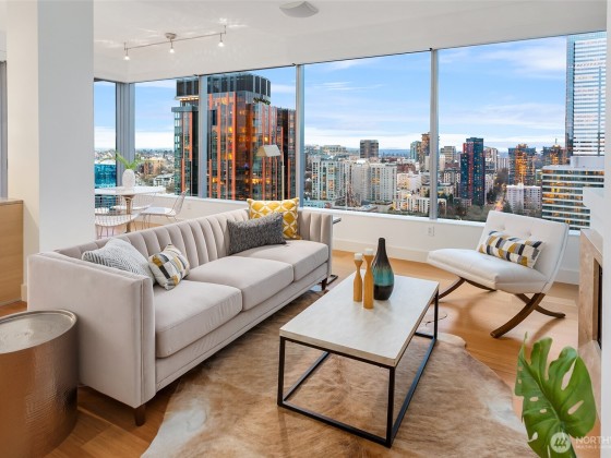Above the Sparkling City lights of Seattle, enjoy floor to ceiling views of snowy mountaintops and the Bellevue Skyline 8 miles away. This lovely Southeast corner home features all the amenity one would expect above Seattle's premier Hyatt Hotel; unique access to 5-Star hotel amenities: 24-hour concierge, room service, Gym, sauna, steam room, saline lap pool & spa. Residents-only club features a BBQ terrace, dog lounge, grooming station and event room. Uniquely remodeled with a spacious chef's kitchen and extra storage space. Walk to shopping, theaters, restaurants, Amazon, Google, Apple and Meta, Whole Foods. Easy access to I-5, light rail & SLU streetcar. The veritable foodie paradise of Capitol Hill or Pike Place Market at your doorstep.