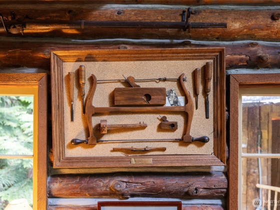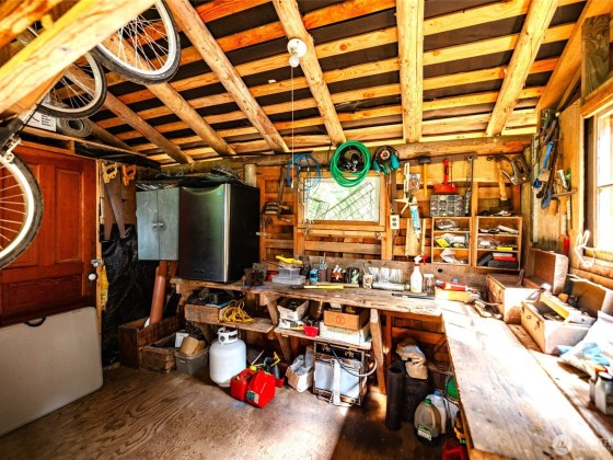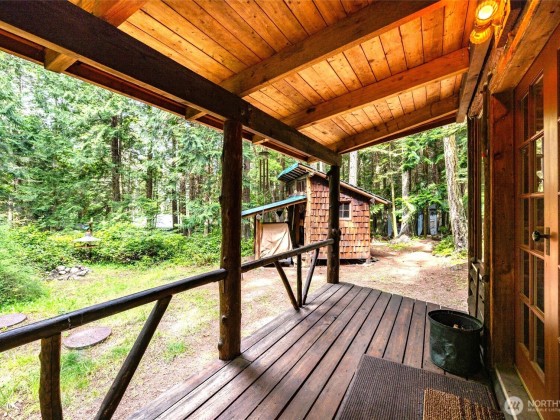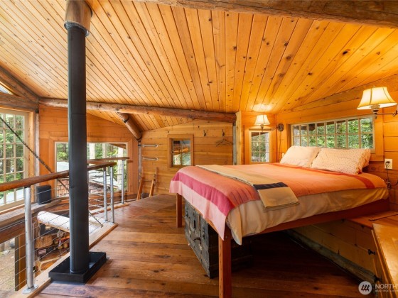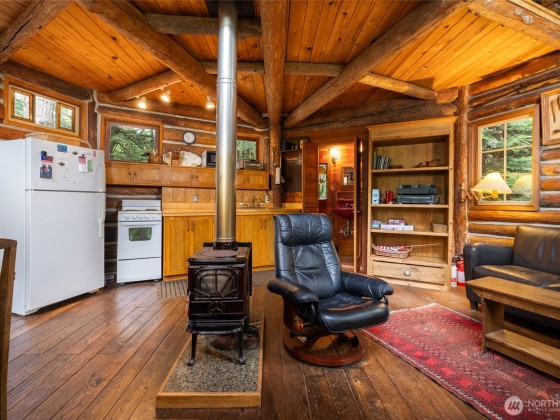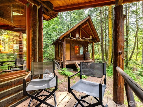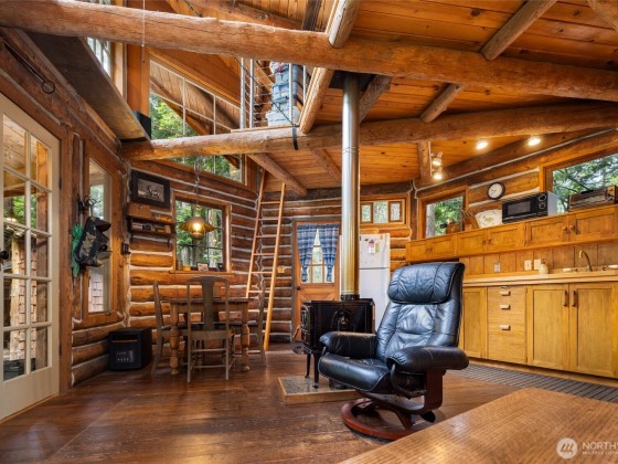 Tucked away on private Center Island, this enchanting log cabin is perfect for someone wanting a one-of-a-kind getaway. Cozy interiors with rustic charm, unique details, central wood stove, and panoramic windows bring nature inside. A darling detached guesthouse with half bath offers extra space for guests or creative pursuits. Carport and tool shed provide shelter for your projects and included golfcart. Perfect for weekend getaways, artistic inspiration, or a secluded lifestyle. Your serene island sanctuary awaits! Fully furnished and ready to enjoy. This is a very special place! Community shares two deep water docks, private airstrip, clubhouse, and full-time caretakers. Broadband coming available soon. Very easy access by water taxi.