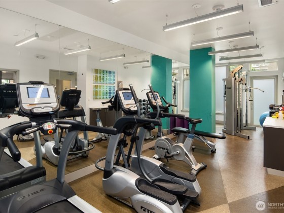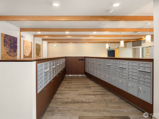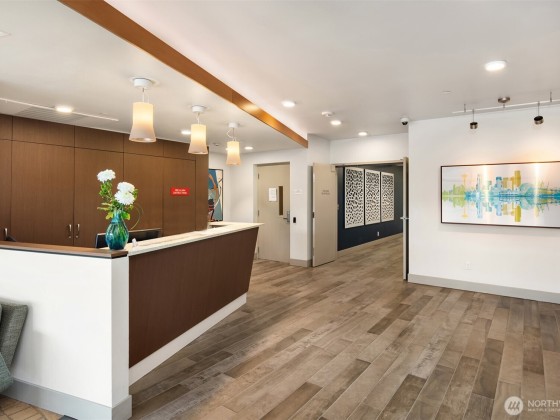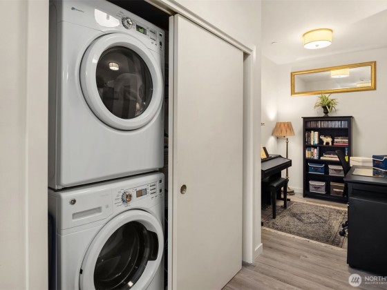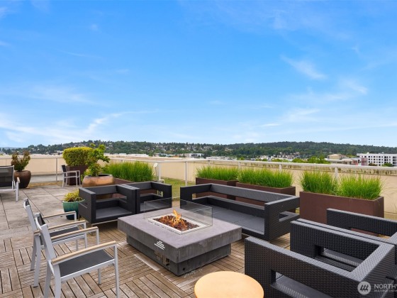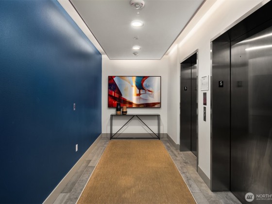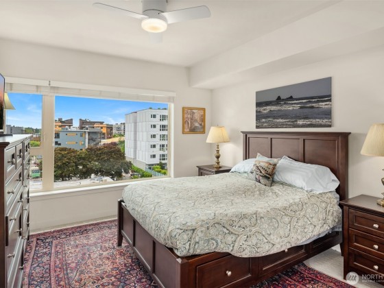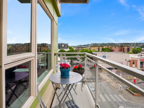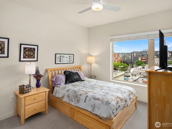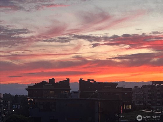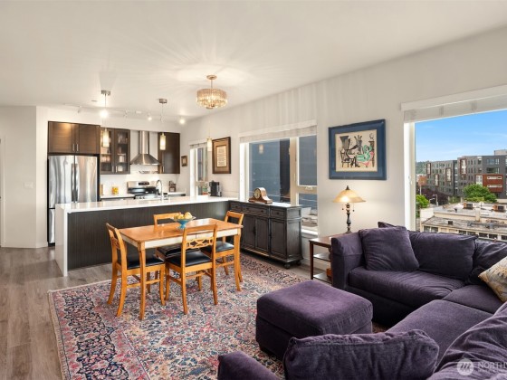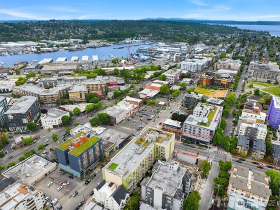 Light-filled corner unit with 9' ceilings in a prime Ballard location with sweeping roof top views of Salmon Bay and stunning sunsets from the 5th floor. Thoughtfully upgraded with white kitchen countertops, new appliances, custom shelving and designer fixtures throughout. The open layout includes a spacious entry and versatile den, perfect for a home office or reading nook. Two garage parking spots (one EV-capable) and a large storage unit add rare convenience. Enjoy top-tier building amenities: rooftop deck, concierge, fitness center, pet wash, bike storage, and dog run. Just steps to shops, restaurants, grocery stores, transit, Burke-Gilman Trail & the Ballard Farmers Market. City living with comfort, style, and breathtaking views.