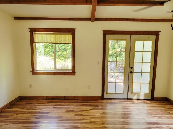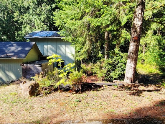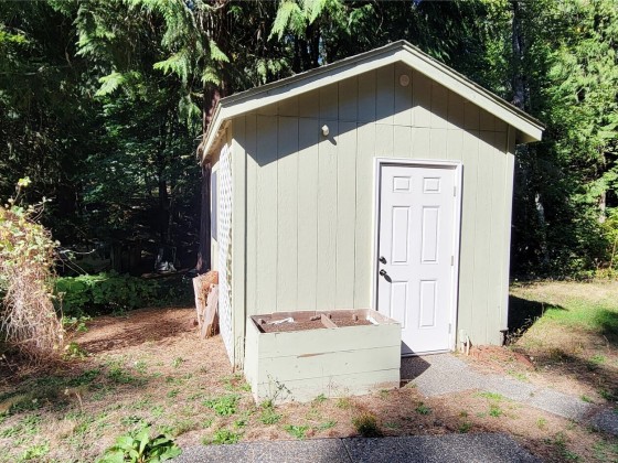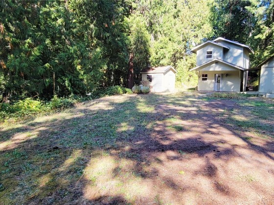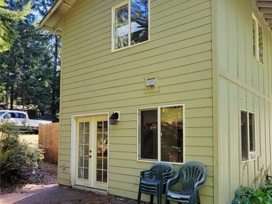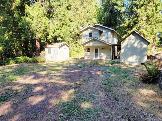 Nestled in the serene Olympic Trails community, this charming two-story cabin sits on a beautifully landscaped double lot, spanning just under half an acre. Perfect for a weekend escape, a summer retreat, or year-round living, this delightful gem promises comfort and tranquility. The main floor features a cozy kitchen and inviting living room, with elegant French doors opening to a spacious patio and lush backyard. Upstairs, the bedroom offers ample storage with two closets, complemented by a full bathroom and sunlit skylights. Enjoy exclusive community beach for clamming, oyster picking, or simply soaking in the stunning coastal scenery. With nearby trails for hiking and a harbor for boating, adventure awaits just moments from your door.