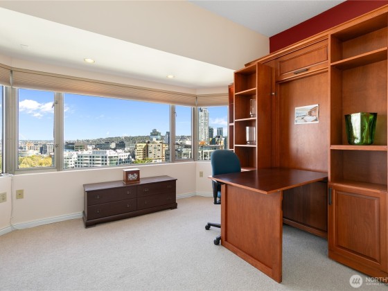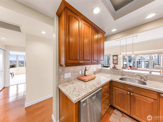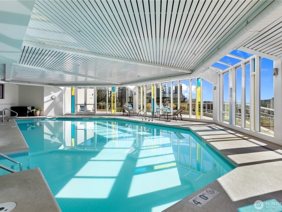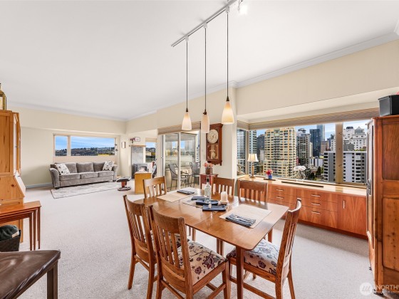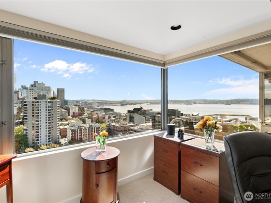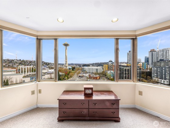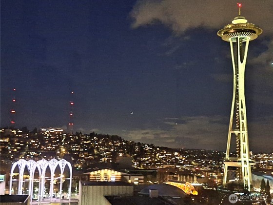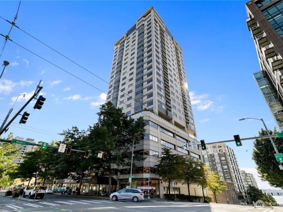Seller to offer up to 1yr of pre paid HOA dues!* Sweeping views of downtown, Space Needle, Elliott Bay, Mt. Rainier & the Waterfront from this 15th-floor corner unit. HOA covers: water, sewer, garbage, gas, Comcast TV, central A/C, 7/24 concierge, gym, sauna, hot tub, reservable Club Room, business center & an expansive rooftop deck. Premium, worry-free living. Two Bed/2 bath condo is flooded w/ natural light from walls of windows & private balcony. Updated baths and kitchen w/SS appliances, 9ft ceilings, motorized blinds, built in credenza in dining area, entertainment center in the living room & a large 2nd bedroom. Secured DEEDED parking spot & FREE guest parking, evenings & weekends. Walkscore® of 97.