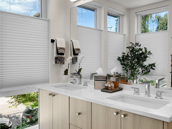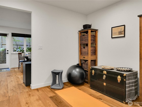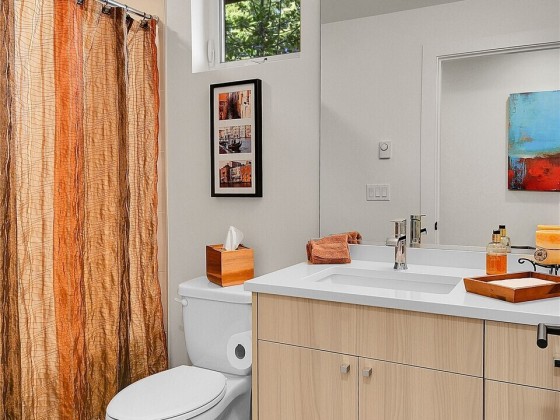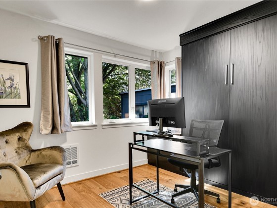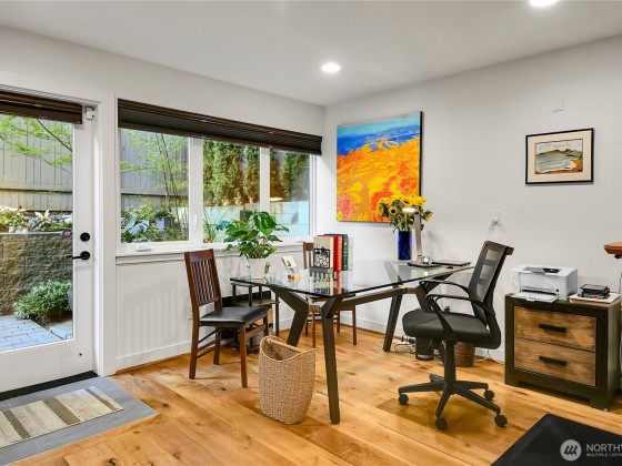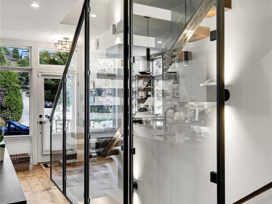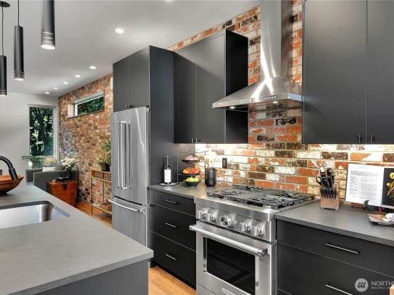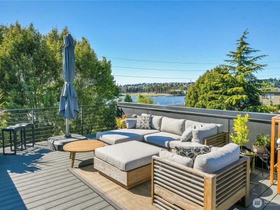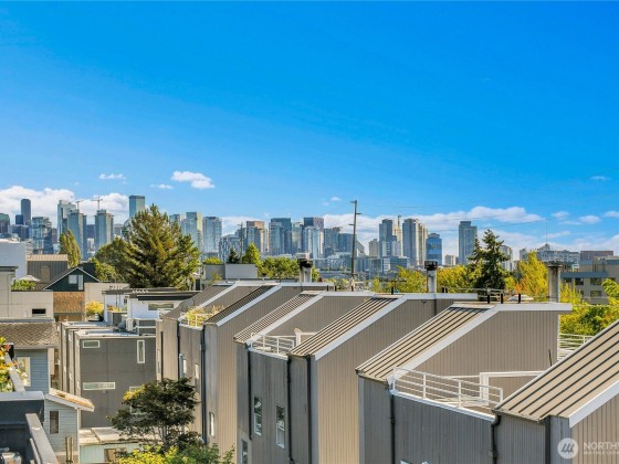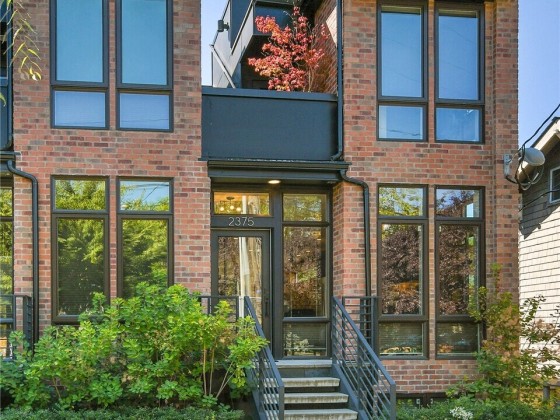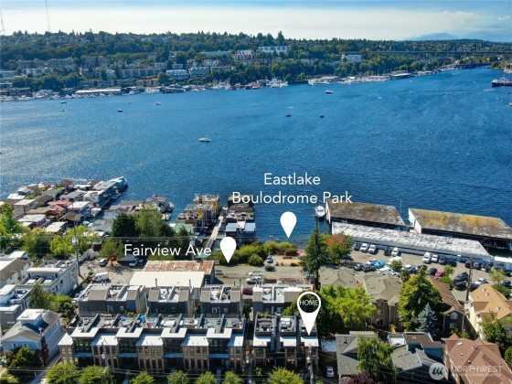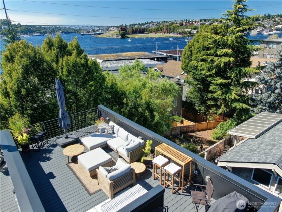 One block from Lake Union, this rare end-unit at The Nest – a sophisticated Eastlake brownstone community – blends East Coast inspiration with bold, PNW style. Industrial cool meets refined design: glass staircase, black quartz counters, brick accents & elegant hardwoods capture the feeling. The top floor is its own retreat with stunning walk-thru closet, part of a spa like ensuite. Three more bedrooms offer space for guests, work or hobbies. The lower level, presently a home-office, features a potential ADU. Step outside to your own private garden space. The rooftop offers privacy and expansive views unique to this home, perfect for intimate entertaining on these lovely Seattle summer evenings. Covered parking & AC included. Welcome home.