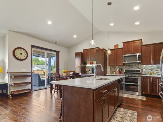 Modern rambler with large bonus room above the garage—ideal for guests, office, or play space. The open layout kitchen is the heart of the home, featuring a spacious island, pantry, beautiful cabinetry, luxury countertops, & gas range (with pot filler)—a space that brings everyone together; bright, functional, & made for connection. Enjoy morning coffee on the front porch then evenings on the covered back deck (with gas BBQ hookup) overlooking a fully fenced, beautifully landscaped yard. The primary suite is separate from the other bedrooms & includes an oversized spa-like shower, dual-sink vanity, & walk-in closet. Also features a large hallway, wide stairs, & modern flooring & finishes. Near schools, parks, & shopping for an easy commute.