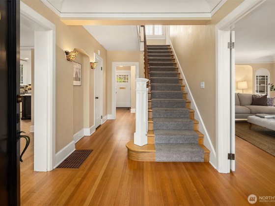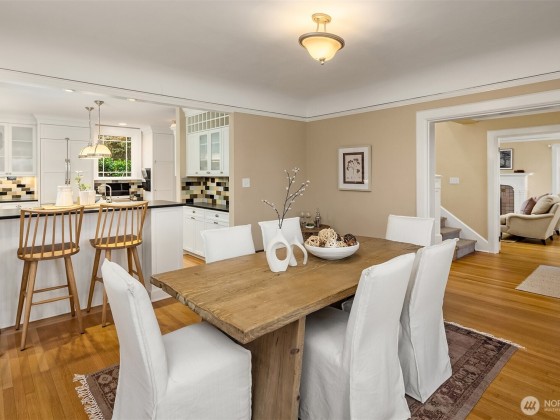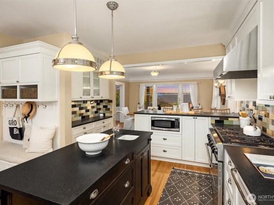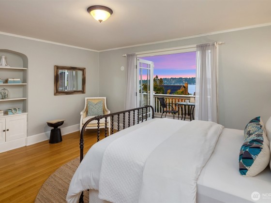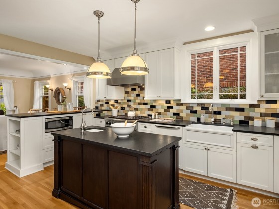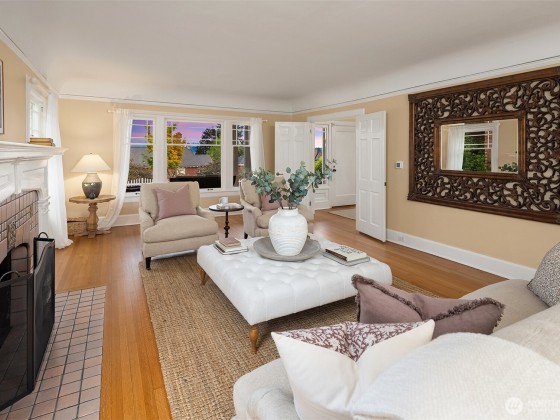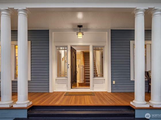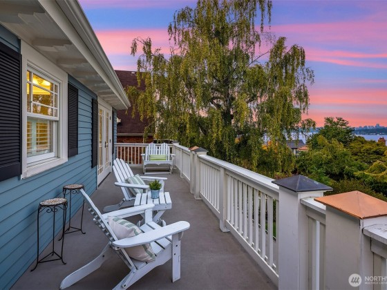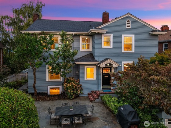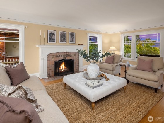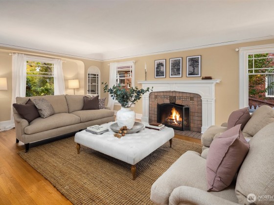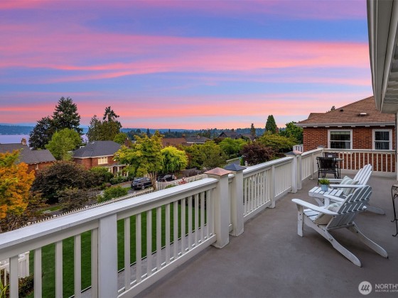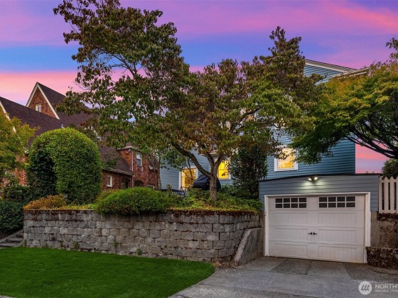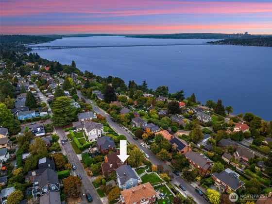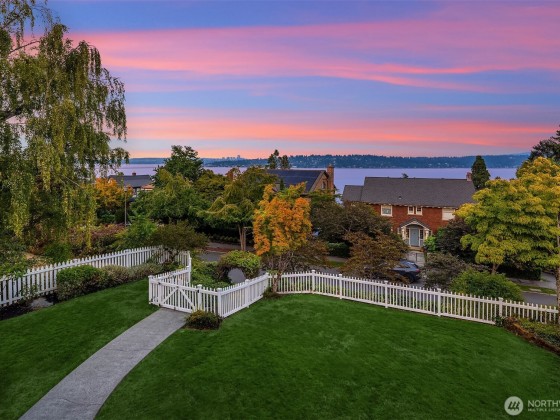 Set along one of Seattle’s most sought-after streets, this stately Colonial home blends timeless architecture with thoughtful updates. A wide, welcoming covered porch overlooks the expansive front lawn, while the light-filled and elegant interior showcases coved ceilings, crown molding, and newly refinished hardwood floors. The renovated kitchen offers honed-granite counters, a center island, eat-in bar, built-in desk, and easy access to the backyard patio and gardens. Upstairs, three spacious bedrooms with Andersen windows open to a veranda deck capturing lake and mountain views. The fully finished lower level includes a new bedroom, full bath, and media/game room. Attached garage plus gear storage area. Three blocks from Lake Washington.