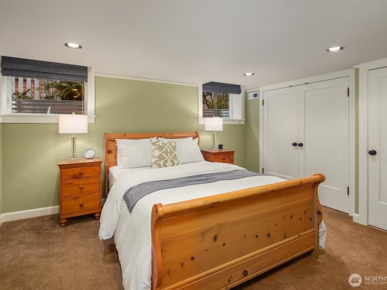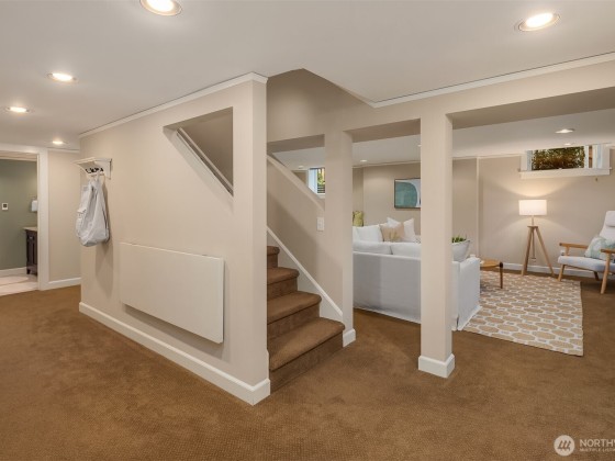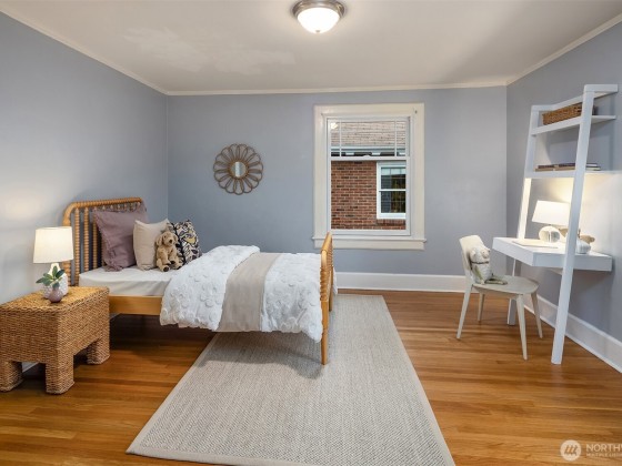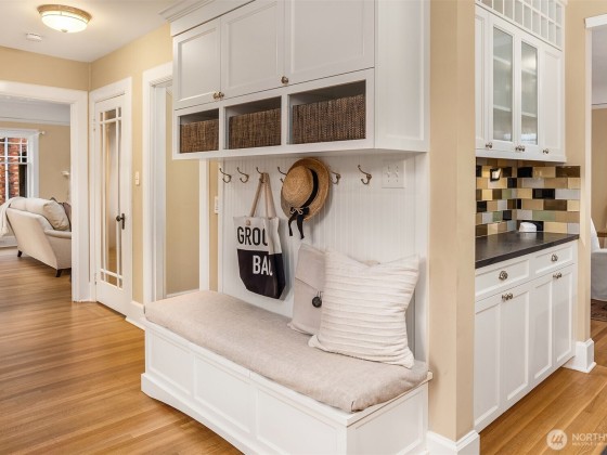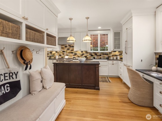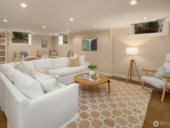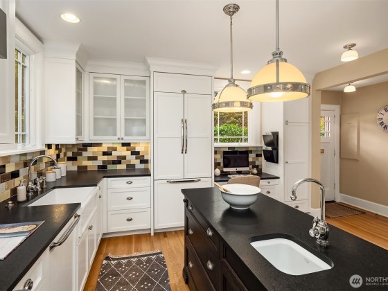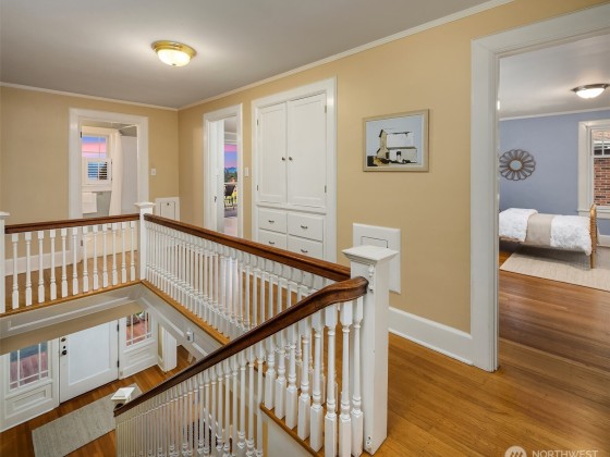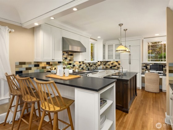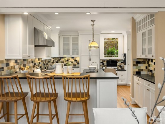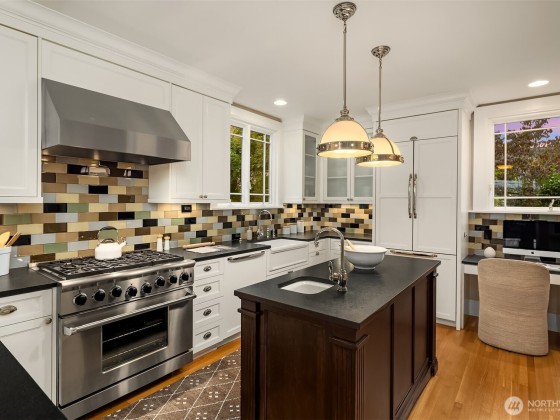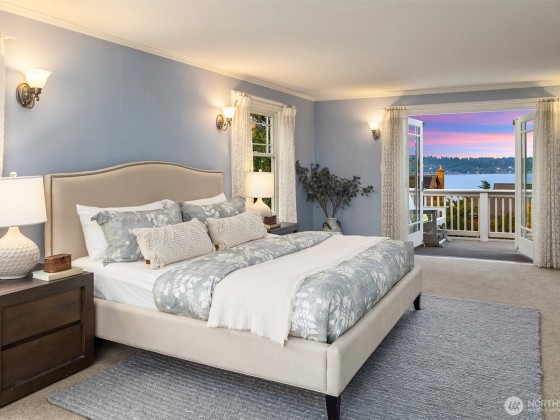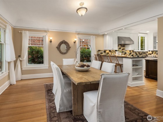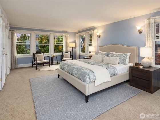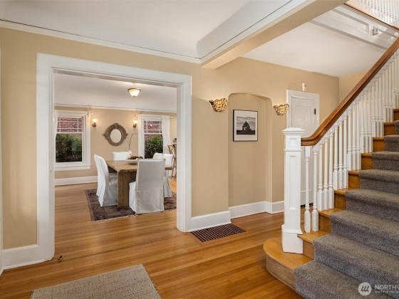 Set along one of Seattle’s most sought-after streets, this stately Colonial home blends timeless architecture with thoughtful updates. A wide, welcoming covered porch overlooks the expansive front lawn, while the light-filled and elegant interior showcases coved ceilings, crown molding, and newly refinished hardwood floors. The renovated kitchen offers honed-granite counters, a center island, eat-in bar, built-in desk, and easy access to the backyard patio and gardens. Upstairs, three spacious bedrooms with Andersen windows open to a veranda deck capturing lake and mountain views. The fully finished lower level includes a new bedroom, full bath, and media/game room. Attached garage plus gear storage area. Three blocks from Lake Washington.