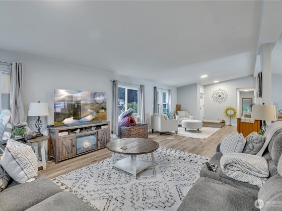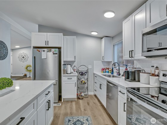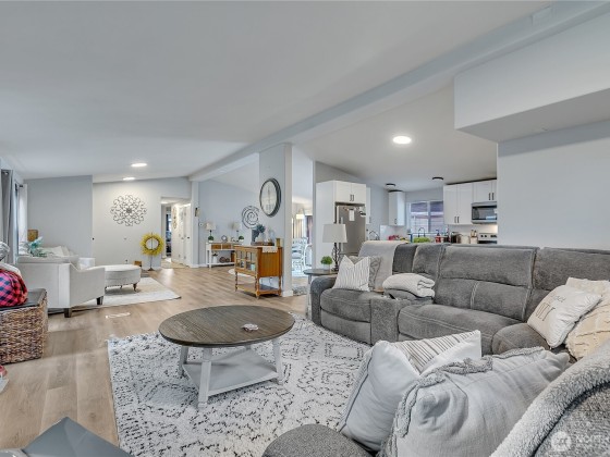 Move in Ready Single Level Home with 3bed and 2bath with over 1750+ sqft of Open concept Living. Fully Remodeled with White Shaker Cabinets, Large Island, Quartz Countertop and SS Appliances. New Luvary Vinyl Plank Flooring Throughout. Vaulted Ceilings with large windows to that let in plenty of light. Master Bdrm has Large Walk in Closet with On Suite Bath. Home sits on large corner lot that is fully fenced with mature landscaping. Generously-sized back deck that is perfect for summer bbq & outdoor entertaining. Great location for easy access to HWY 410, just minutes away from schools and all your shopping needs!