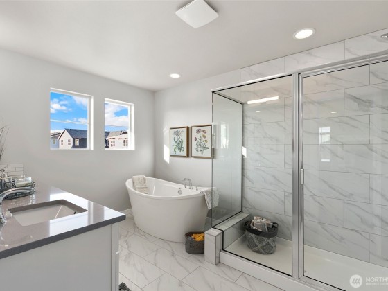 $50,000 Seller Credit w/ Trusted Lender. Model Home Sale! Refrigerator, W/D & window coverings included. Our E1 Plan offers a roomy, open kitchen with quartz counters, a tile backsplash, and under-cabinet lighting. Luxury vinyl plank flooring and a cozy electric linear fireplace grace the main level, along with a bedroom and 3/4 bath. Upstairs, the spacious primary suite boasts a 5-piece bath with double sinks, freestanding tub & tile flooring. Three additional well-sized bedrooms and a generous bonus room await you w/ 2nd story balcony access. Step outside to a fully fenced, beautifully landscaped yard, and relax on the covered side porch with a gas BBQ stub. Brokers, kindly register buyers before their first visit.