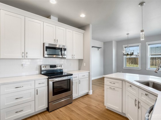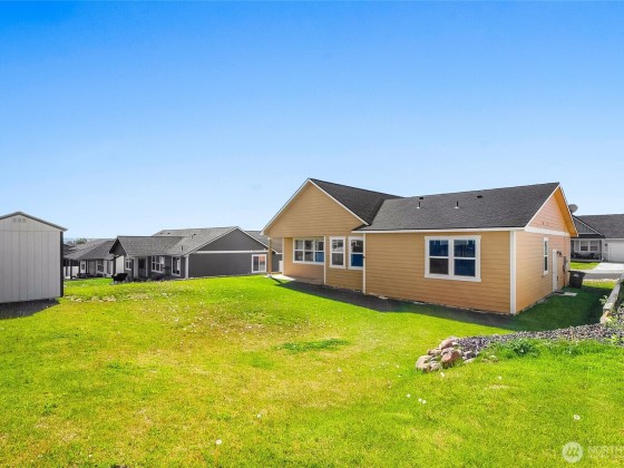 Beautifully designed 3 bedroom, 2 bathroom home offering 1674 sq ft of bright, open living space on generous 9000 sq ft lot. Built in 2022, this single level home blends modern finishes with functional design. The kitchen features sleek quartz counters, white cabinetry, a huge island with seating, and stainless steel appliances. The primary suite includes a huge walk-in closet, dual sinks, fully tiled shower and separate soaker tub. Additional upgrades include custom blinds, landscaped yard with underground sprinklers, backyard shed for hobbies or additional storage, insulated and painted garage, and all appliances are included. Centrally located and move-in ready, just unpack and start enjoying your new home!