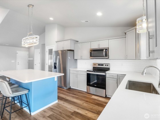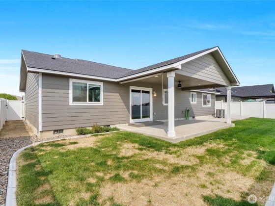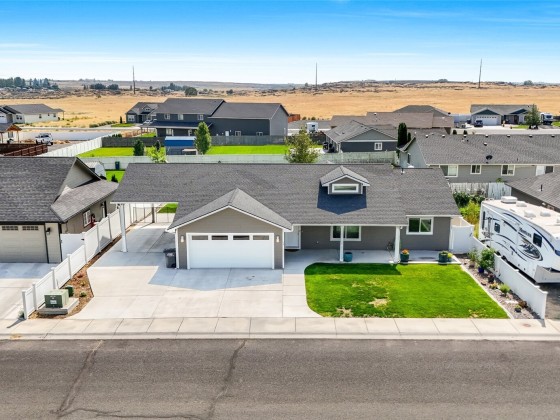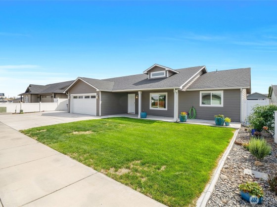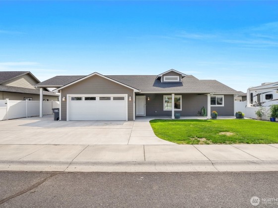 Move-in ready 2020 home featuring 3 bedrooms, 2 bathrooms, and a spacious open-concept floor plan. The stunning kitchen is a true highlight with white quartz countertops, stainless steel appliances, soft-close cabinets, a large island with bar seating, and a pantry - perfect for cooking and entertaining. The great room offers plenty of natural light with modern, neutral finishes throughout the home. Step outside to a fenced backyard with a covered patio, ideal for outdoor living. The yard is fully landscaped with front and back underground sprinklers and curbing for easy care. A painted and insulated garage adds comfort and storage, while the carport covered RV parking with 50-amp service makes this property a rare find.