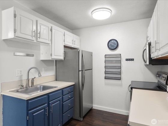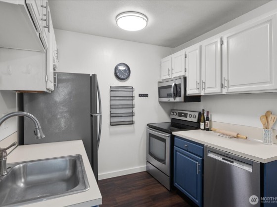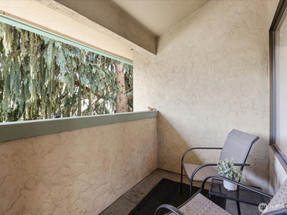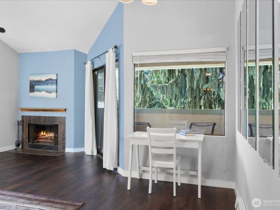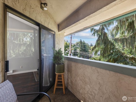 Enjoy the top-floor advantage in this secure building in North Seattle. The light-filled, large 1-bedroom unit boasts an open floor plan with vaulted ceilings, an inviting living room with a cozy wood-burning fireplace, private patio to relax among the trees. The spacious kitchen features stainless steel appliances and check out the fabulous tile in the bath. You'll appreciate the new laminate floors, too. Great investment: no rental cap, low HOA dues, on-site laundry, reserved parking. Easy access to buses, I-5, light rail, Farmers Market, restaurants, parks. A gem in the heart of North Seattle!