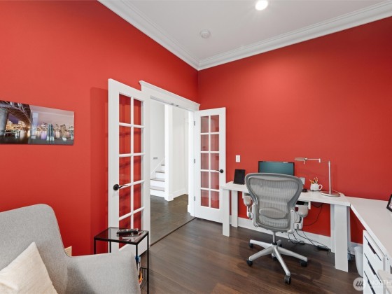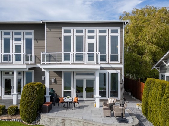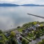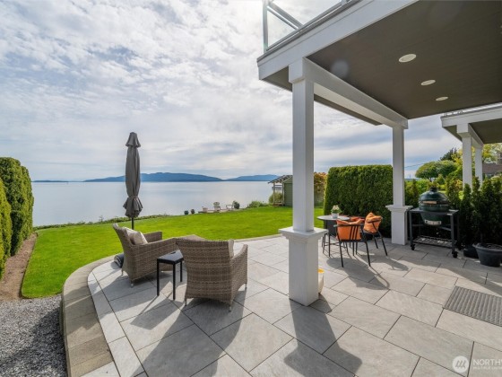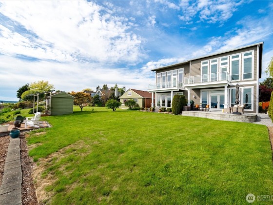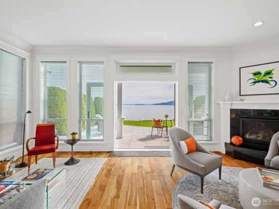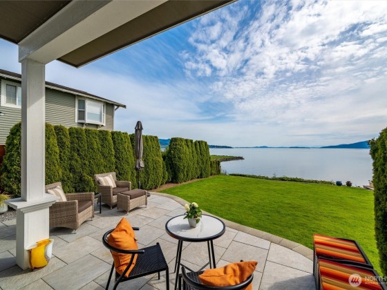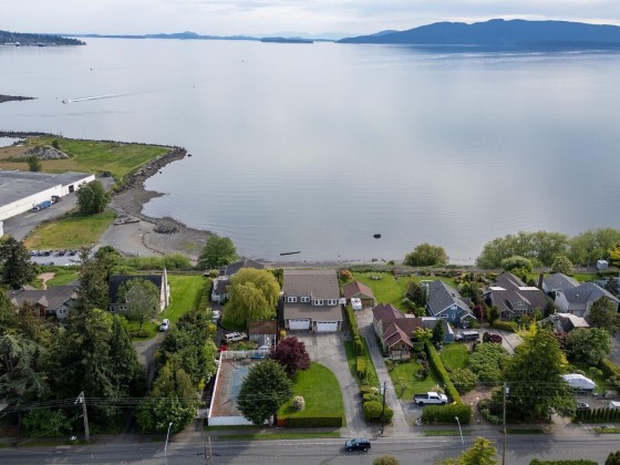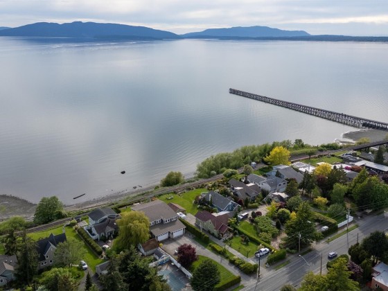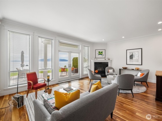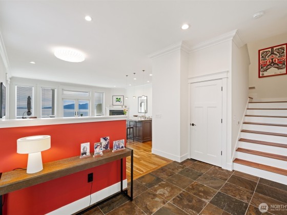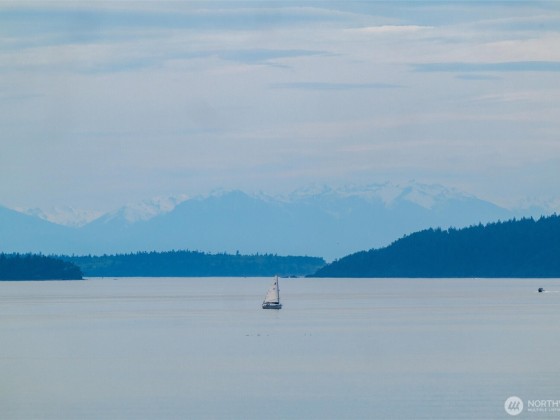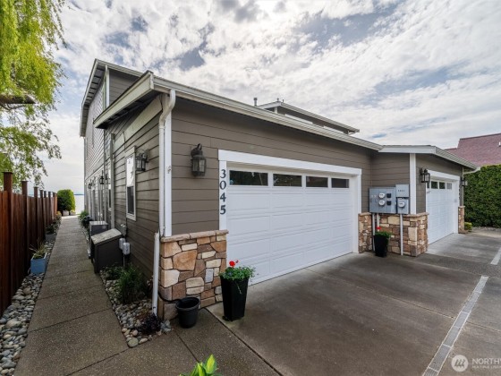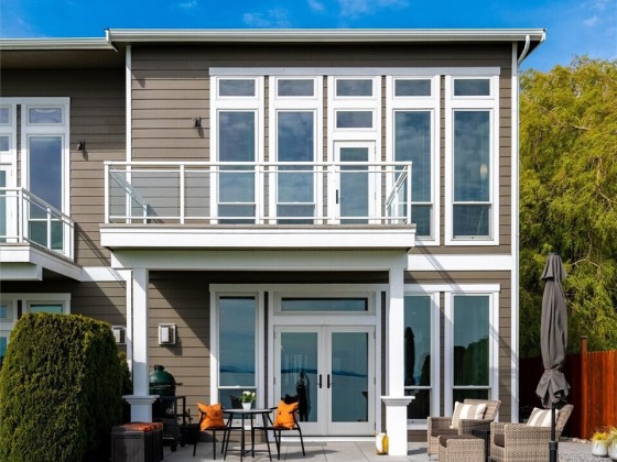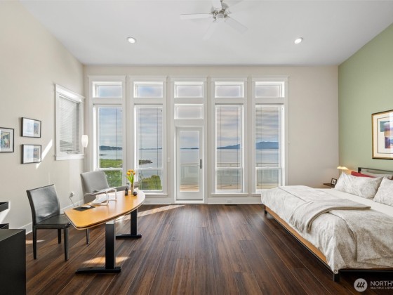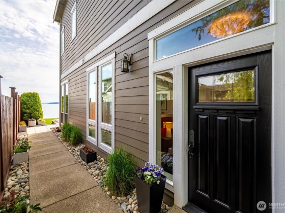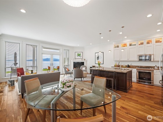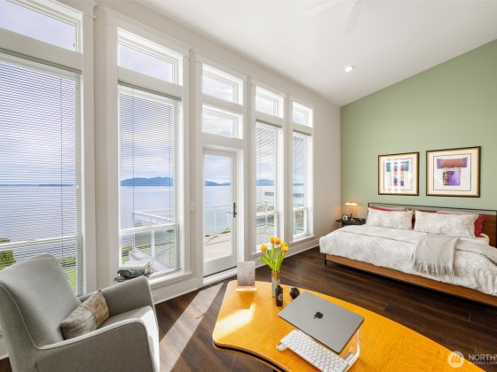 Luxury townhouse w/amazing southern bay/sound, island & mountain views through walls of windows up to soaring vaulted ceilings & high-end finishes throughout. This 2580 sqft unit lives like a similarly sized house w/3 bedrooms, office, 2-car garage w/the lock & go convenience of a condo. Fabulous primary suite features a spa bath & separate dual-shower enclosure, radiant heat, walk-in closet, and large balcony w/sweeping unobstructed views. Originally built in 2010, the current owners have completely gone through entire unit, upgrading fixtures, flooring, windows, appliances, patio. Complete interior paint refresh. Private patio, lawn and set back from the road with off-street parking. Rare two-unit association amongst single-family homes.