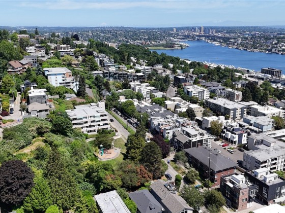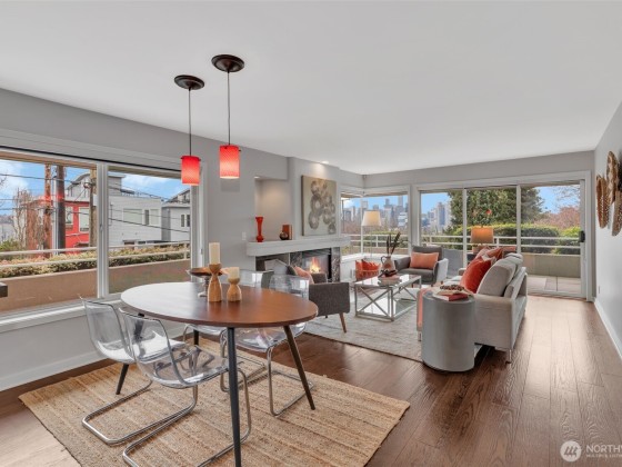 Iconic Queen Anne Corner Unit with Space Needle Views! Welcome to your Queen Anne escape, an exceptional home with panoramic skyline views! This updated 2-bedroom, 2-bath condo is filled with natural light and features hardwood floors, a wraparound patio with iconic South and East exposures, and an open living space with a gas fireplace. The primary suite is spacious, and the second bedroom works well for guests or a home office. Enjoy two side-by-side garage parking spots and a large private storage room. With strong Walk, Transit, and Bike Scores, you're close to cafes, restaurants, tech campuses, and everything Queen Anne has to offer. Well-managed HOA make for low-maintenance living in one of Seattle’s most sought-after neighborhoods.
