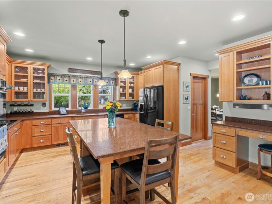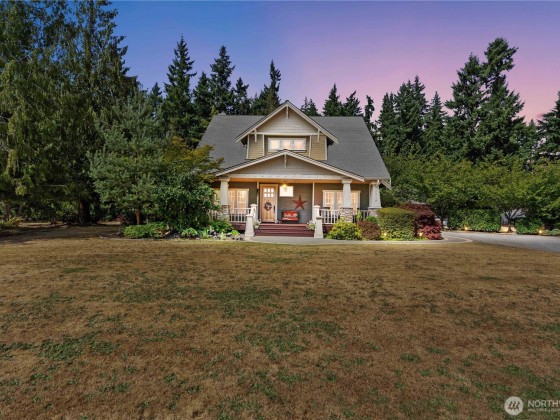 Luxury country living just 20 minutes from Bonney Lake or Enumclaw! This stunning Craftsman home offers an open floor plan with hardwood floors, solid wood doors, wainscoting, crown molding, and wrought iron details. The chef’s kitchen features an oversized island, flowing into a bright dining area and generous living room with a wood-burning fireplace. Enjoy a perfect work from home den on the main floor. The elegant primary suite includes a spa-like bath. Set on 5 private acres with a huge shop, car lift, covered RV parking, and space for bonfires or wildlife watching from the back patio. Enjoy elk, deer and eagles in your own backyard. Even wired for a back up generator and NO RTA tax! This is elegance, privacy, and space at its best!
