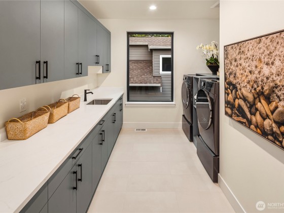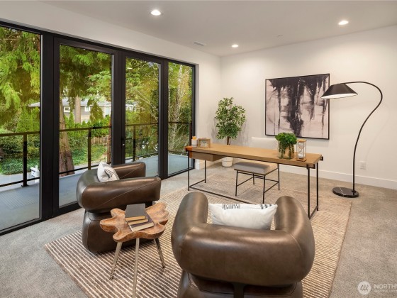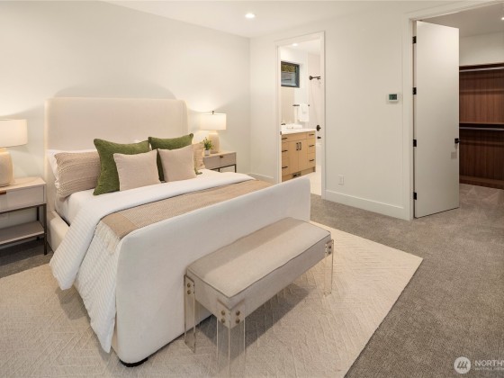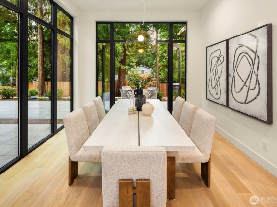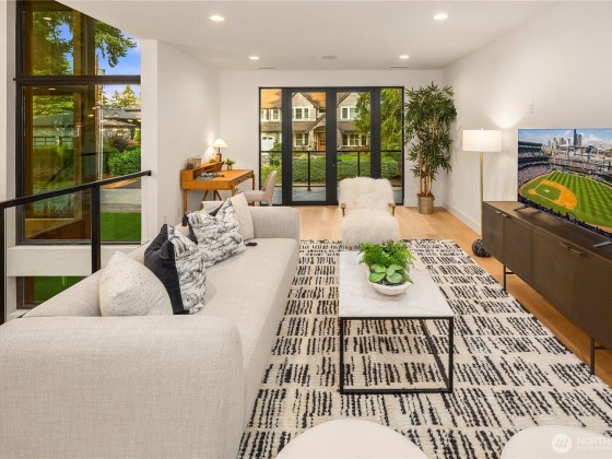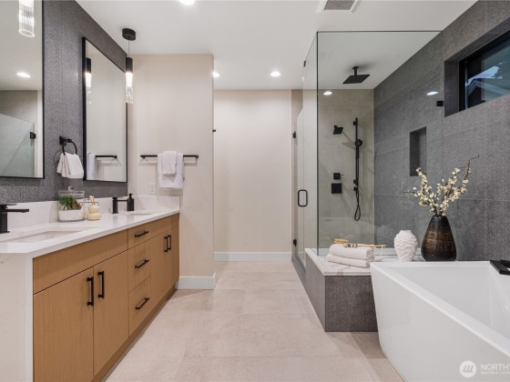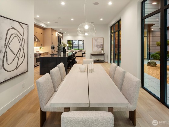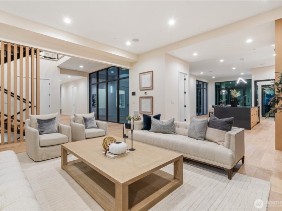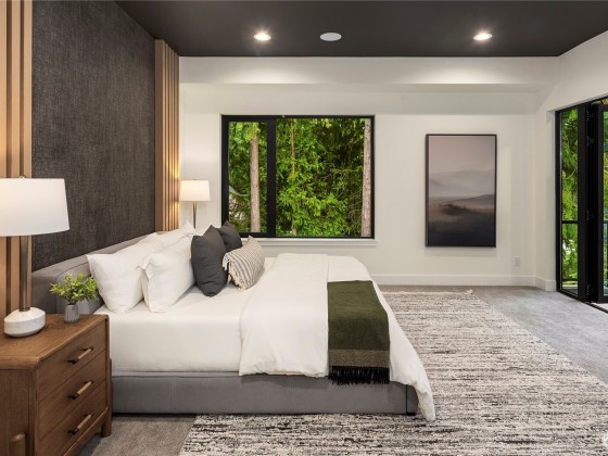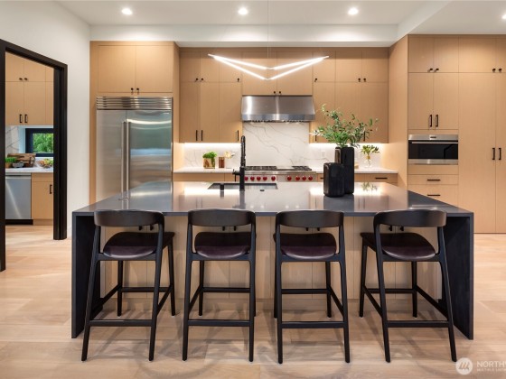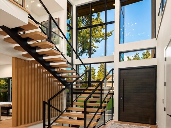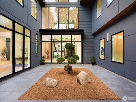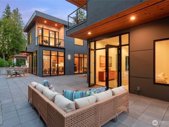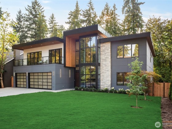 Stunning modern contemporary estate in coveted Enatai, Bellevue. New construction with clean lines, soaring 11' ceilings, and walls of glass flooding interiors with natural light. Features 5 bedrooms, 5.5 baths, open great room, sleek chef’s kitchen & prep kitchen, and dramatic floating staircase. Expansive primary retreat includes spa-like bath and one of three private balconies. Flexible lofts, media, and office spaces. Heated bathroom floors, designer lighting, and premium finishes throughout. Seamless indoor-outdoor flow with a Zen-inspired courtyard, and spacious patio. Pre-wired for home theater and golf simulator. Three-car garage and level yard complete this masterpiece, minutes to downtown Bellevue and waterfront parks.