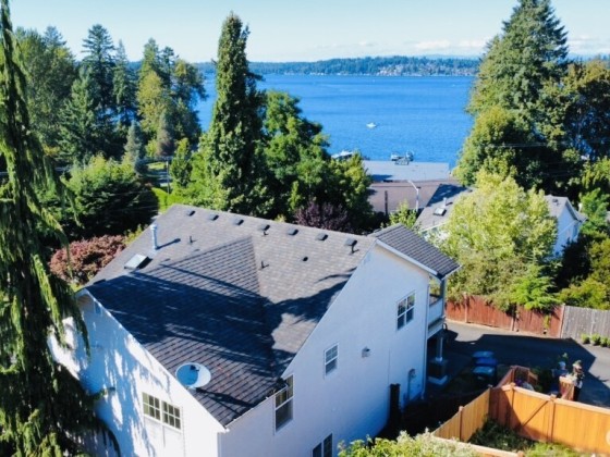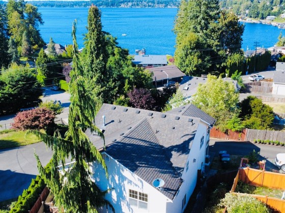 Enjoy stunning lake views from your front deck & living room. Other Lake-view homes are currently listed over $900K. Located just minutes from schools, beaches, parks, restaurants & Costco. This home offers comfort & peaceful living w/ unmatched convenience. The open-concept main level is filled w/ natural lights & features stainless steel appliances, a cozy fireplace & central A/C , a heat pump. The main-level primary suite includes a walk-in closet & a private en-suite bathroom. Downstairs, you'll find two additional bedrooms & a full bath—ideal for guests or home office. The fully fenced backyard is beautifully lit with landscape lighting & the spacious two-car garage includes built-in cabinets. Don't miss this gem—it has it all!