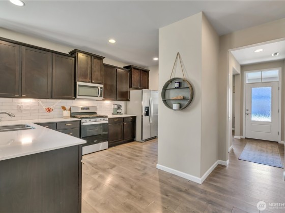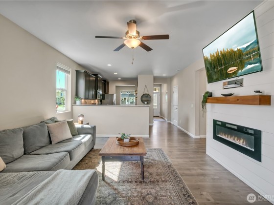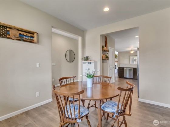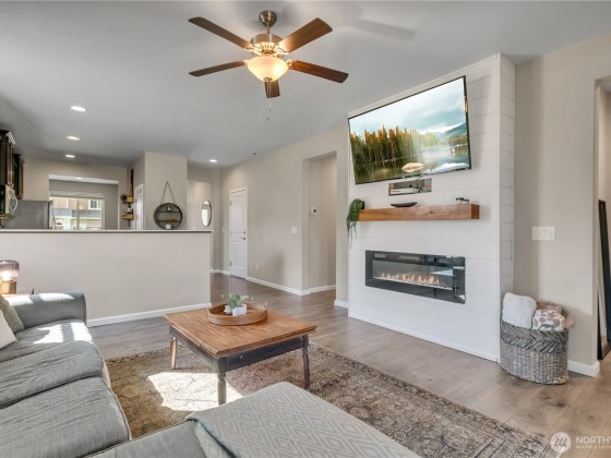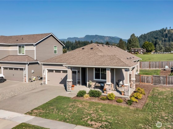Nestled at the base of Mt. Peak in the scenic Suntop Farms neighborhood, this inviting corner lot RAMBLER offers the perfect blend of comfort & community! Find 1,480 sqft of open living space, 3 beds & 2 full baths, all on a fully fenced lot w/ NO rear neighbors! Inside find formal living & dining rooms, kitchen w/ SS appliances, quartz counters, custom tile backsplash & convenient pantry. Durable LVP flooring throughout the main living areas & newer carpet in bedrooms. Primary suite features 5-piece bath & walk-in closet. Outside enjoy the fenced backyard w/ covered patio. 2 car garage provides more room for storage w/ custom racks. Stay comfy year-round w/ new AC! Just minutes from downtown Enumclaw, walking trails, shopping and schools!