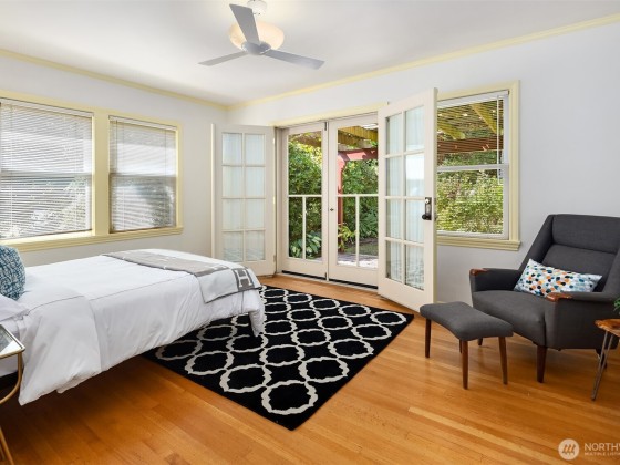 Impeccably maintained and thoughtfully upgraded, this residence captures sweeping vistas and offers effortless proximity to Lake Washington and Seward Park. Outfitted with a fully integrated solar system, heat pump, HVAC, backup furnace, and timeless Spanish tile roof. The lush, irrigated grounds are a year-round jewel, with an automated system keeping the gardens vibrant. Two serene bedrooms and a full bath on the main floor include a sunlit primary retreat that opens to flourishing organic gardens of apples, blueberries, and roses—an enchanting setting of beauty and privacy. The lower level offers a cozy fireside media lounge, guest suite, ¾ bath, and abundant storage. This is a rare chance to own an extraordinary urban sanctuary!