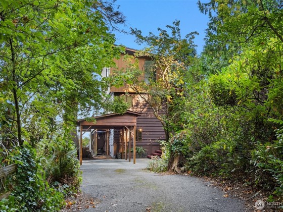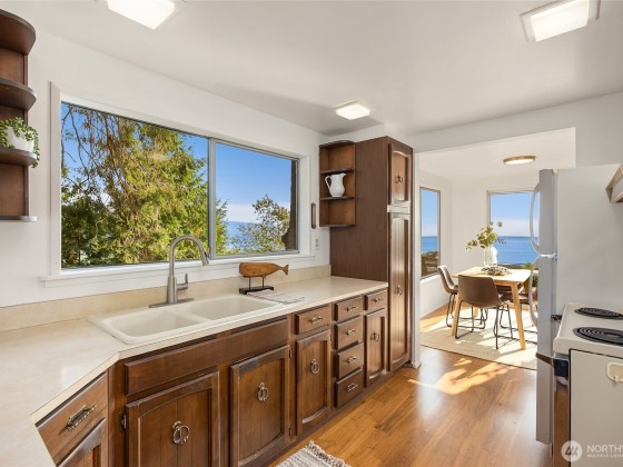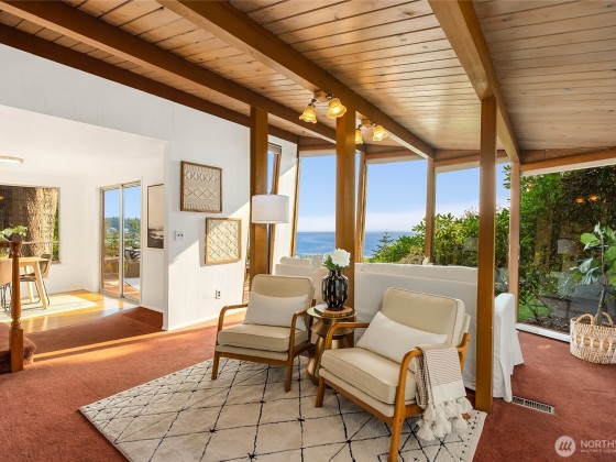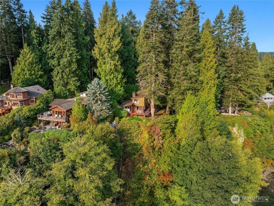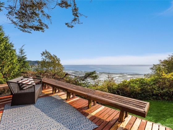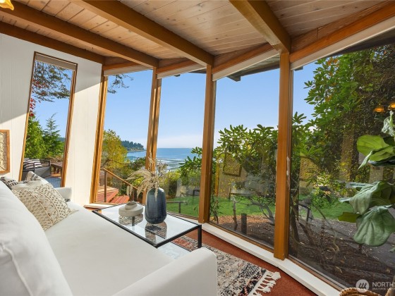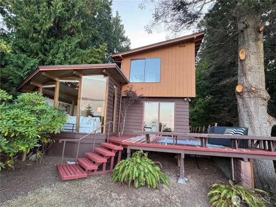 Custom 1970s waterfront home awaiting your loving attention. Ideally located with views of Seattle and the shipping lanes, this home is minutes to the Seattle ferry for easy weekend getaways or the daily commute. Both bedrooms and nearly every room in the house boast a view of the water. Solidly built with a newer roof, private well, good septic system, and fully bulkheaded, there is a permitted boat house and stairs to the beach in need of repair. The large walk-out unfinished basement is perfect for a workshop or more. Savor the peaceful & magical acre of grounds offering soaring cedar trees, an open grassy area, and an outdoor patio with a stone fireplace. Come bring your ideas and roll up your sleeves - make this hidden gem shine.