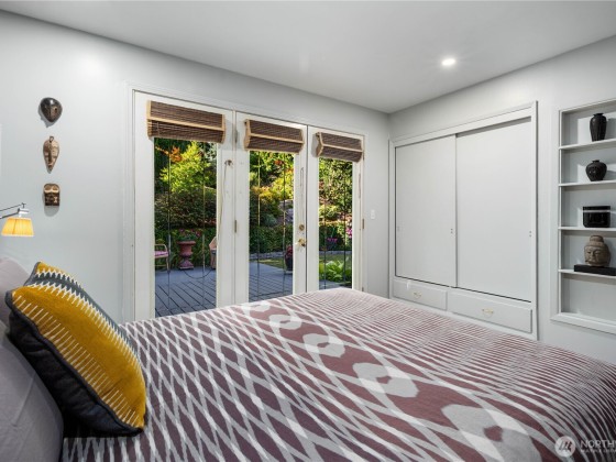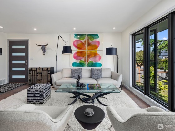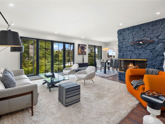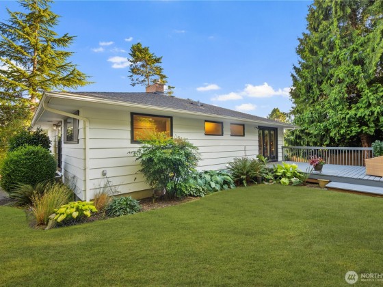 Rare opportunity to own meticulously maintained and beautifully designed home in desirable Lower Gregory Heights. Elevated above the road for privacy and presence. The home is bathed in natural light with floor-to-ceiling windows framing sweeping territorial views including Sound. Enjoy beautifully landscaped private yard and deck with terraced hillside and seating area. Main floor boasts a newly remodeled chef’s kitchen with bar seating, a dining area, gas fireplace, recessed lighting and three bedrooms including a space ideal for office or guest use. Lower level offers large family room with gas fireplace, guest bedroom and mudroom leading to oversized garage with storage and workspace. Ample off-street parking. Close to community pools.