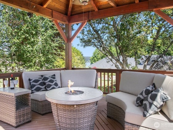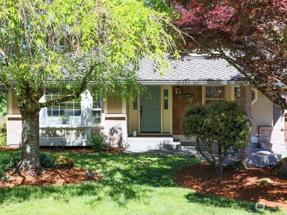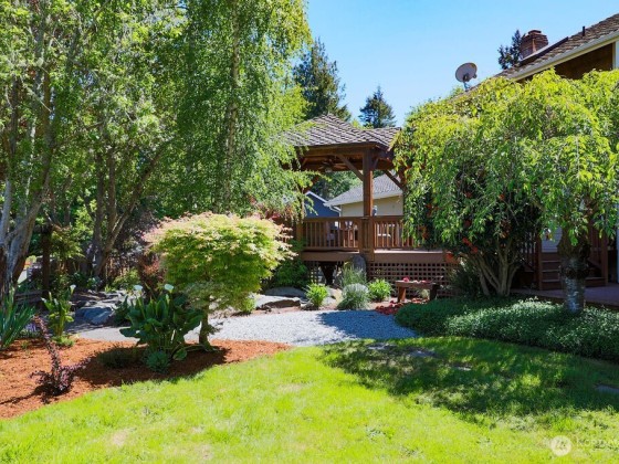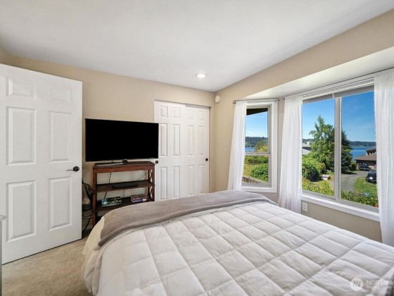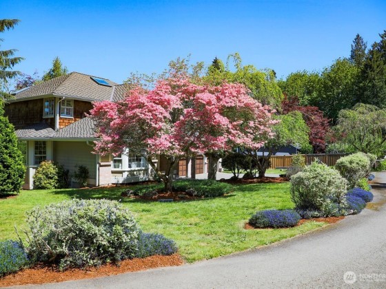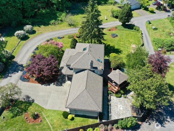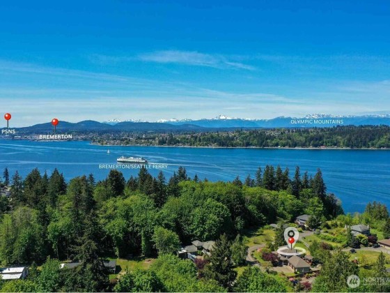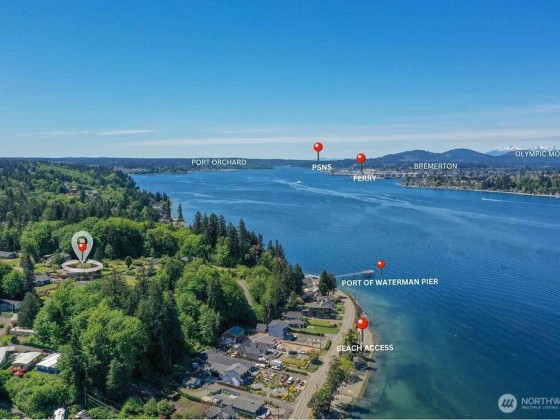 Situated on a private road above Beach Drive, this quiet Port Orchard home features oak floors, vaulted ceilings, and abundant natural light. Main floor offers a formal living and dining room with tray ceiling, kitchen with stainless appliances, wood cabinets, and island seating that flows into a great room with wood-burning fireplace. Also on main: office, powder room, and laundry. Upstairs, enjoy an expansive primary suite with walk-in closet, bay windows, and en-suite bath, plus two guest rooms—one with water view—and full bath. Half-acre lot boasts slate patio, tiered deck, and custom landscaping. Three-car garage and private beach access complete the package. No HOA!