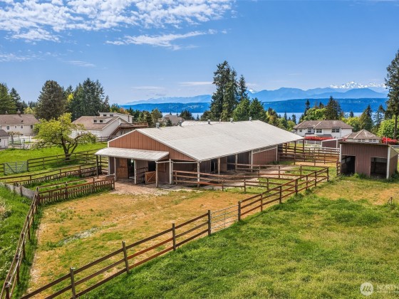 View equestrian facility set on 2 parcels on a quiet, secluded lane outside of Poulsbo. Stunning views of the Olympic mountains and peekaboo sights of Hood Canal define this beautiful ranch. Included on the 13+ acre property is a well-loved view home with sunroom, a separate 4 car garage with 1 bed/bath ADU & deck, an arena, the stables, 3 loafing sheds, equipment shed, manure storage and 12+ fenced pastures. At the center is the covered 96x134 riding arena that has 6 indoor stalls, tackle room, break room and 2 bathrooms. Nearby are the stables that have a wash rack, cross tie bays and 10 rubber-matted indoor stalls, each leading out to their own paddock. A haven of peace and panoramic views–horse facility or not, this property is a gem!