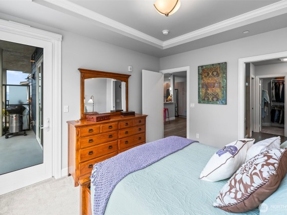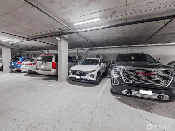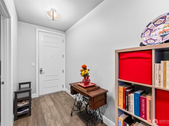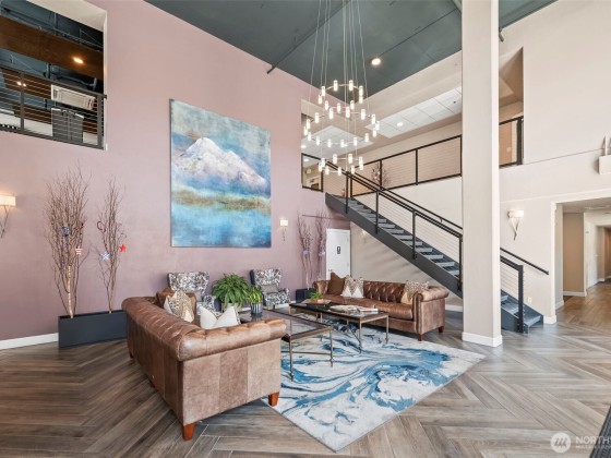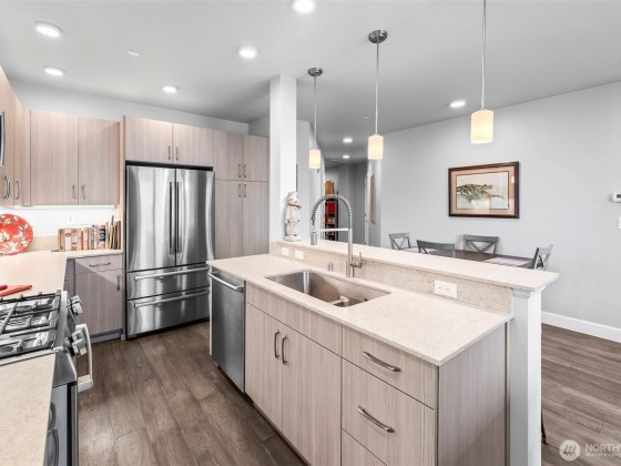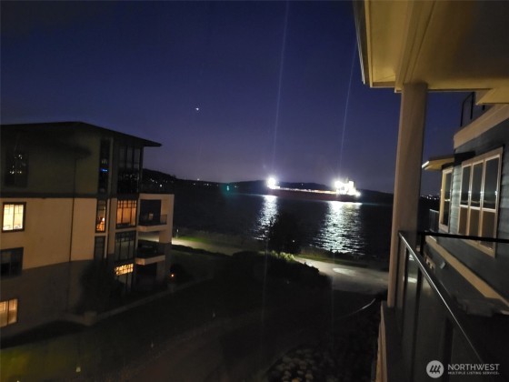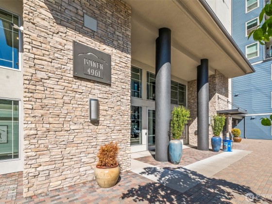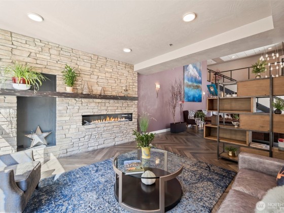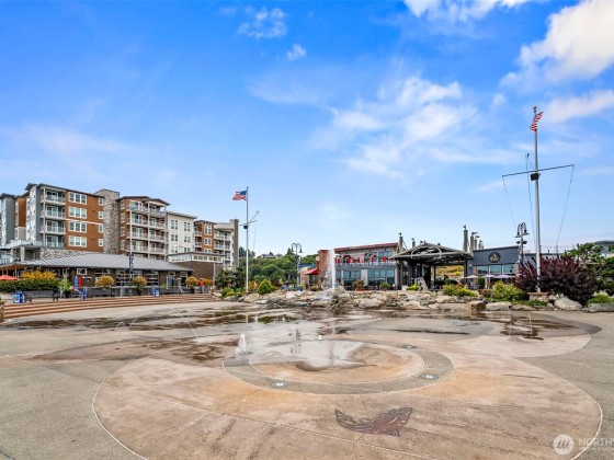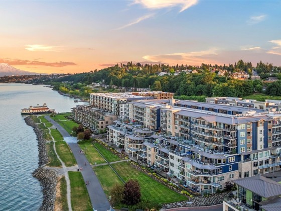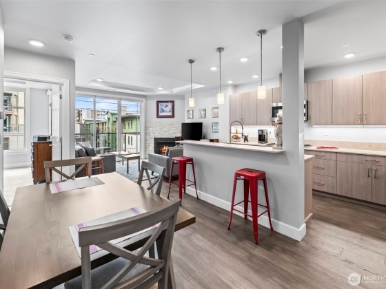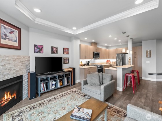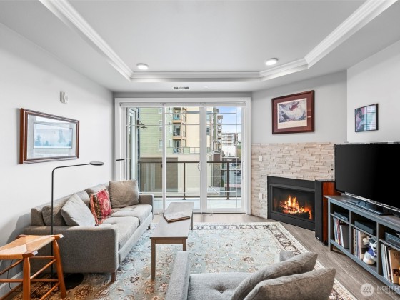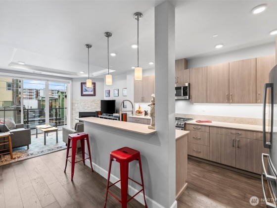 Enjoy a partial view from the deck in this beautiful condo featuring hardwood floors, high ceilings + an open floor plan. Relax by the cozy gas fireplace in the LR or head out to the deck to enjoy the partial view. Whip up delicious meals in the Quartz & stainless kitchen open to the comfortable eating area. Spoil yourself in the primary suite with deck access, private bath including dual sinks, custom tile shower with bench & walk-in closet with organizers. 2nd BR + 2nd full BA perfect for guests. Separate laundry with w/d included. 3 storage units + 2 parking spaces (1 EV) are included. NO stairs and NO exterior maintenance - lock & leave! Dinner, movies, shopping & all the fun of Point Ruston are just a short elevator ride away.