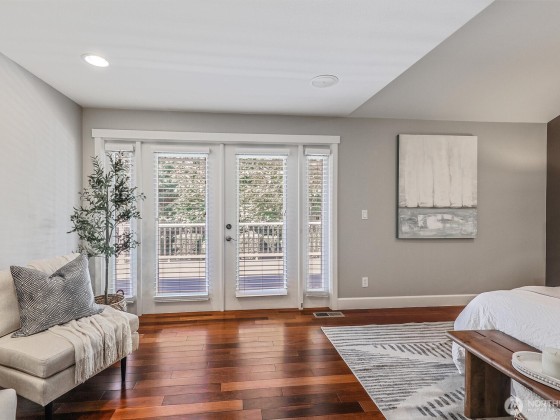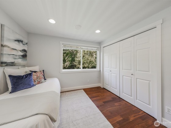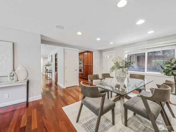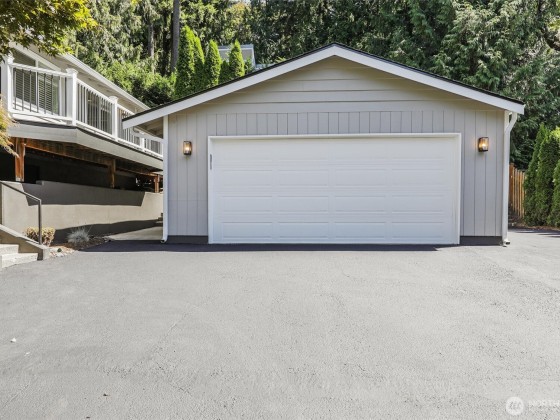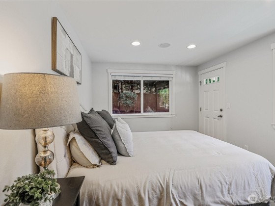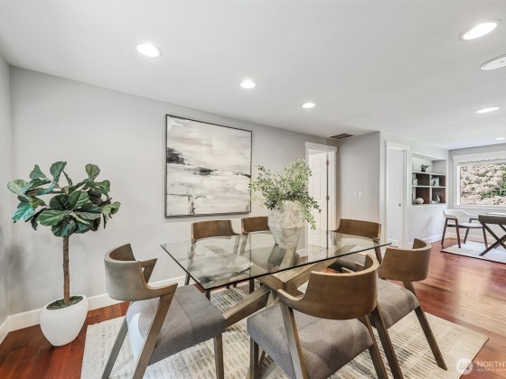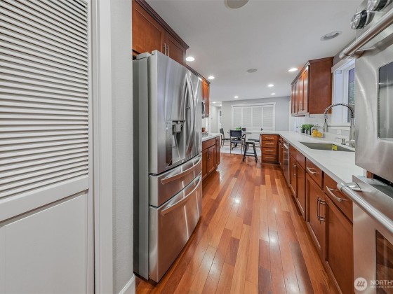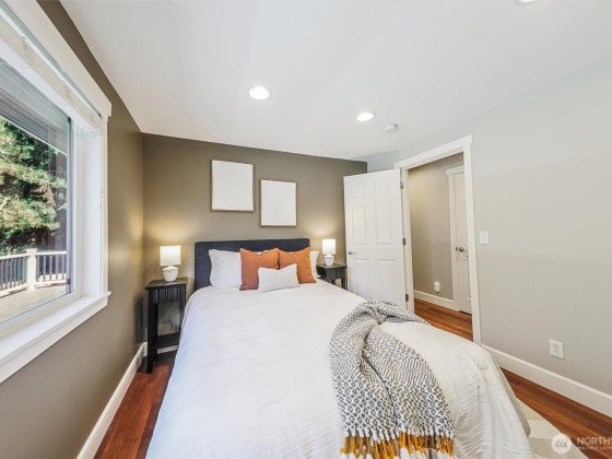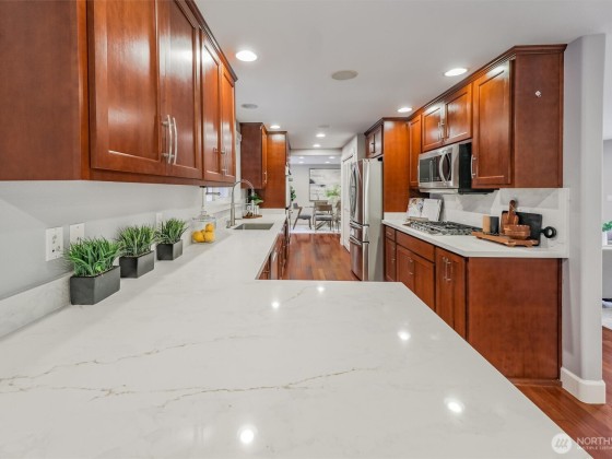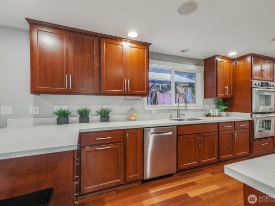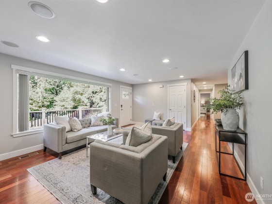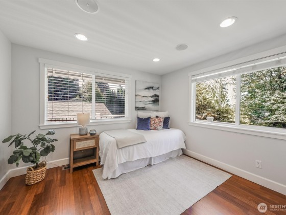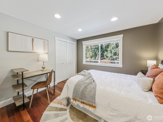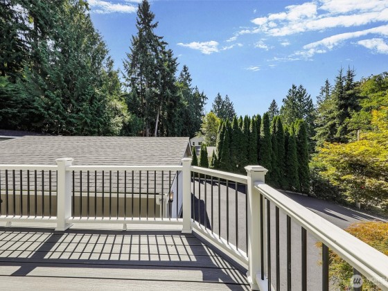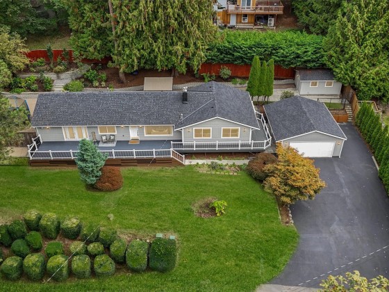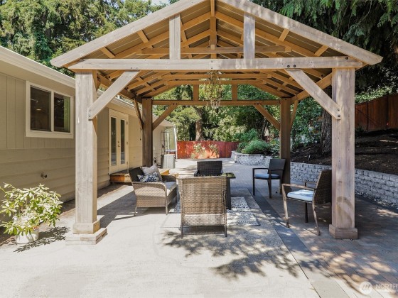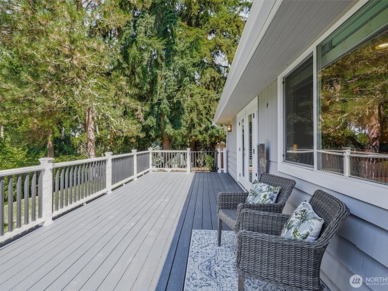 Renovated, Rare Privacy, situated on ½-acre nestled to quiet greenbelt, Cul de Sac. Secluded on quiet dead end street, come home to peace and tranquility! One level home showcases Brazilian Cherry hardwoods, new slab quartz countertops, custom cabinetry, stainless steel app., eating bar in kitchen. Four spacious bedrooms + office. Large living & dining rooms. Primary En-Suite opens to deck, 1.75 updated ba. Surround sound! New roof & exterior paint! Second entrance ideal for guests or multigenerational living. Covered gazebo, gardens, finished outbldg for gym/work/play. Plenty of pkg—min to Microsoft, shopping, dining & beach! Pre-inspected, low mtn backyard. Winter Peekaboo Lake Views & deeded beach rights to Inglewood community beach!