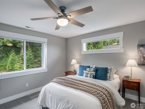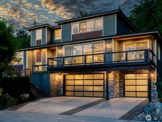 Welcome to this beautiful contemporary home on Bellingham's desirable South Side. Open-concept living features soaring 12' ceilings, kitchen w/7' granite waterfall island, commercial-grade appliances, and walk in pantry. Two inviting outdoor decks provide perfect settings for relaxation or al fresco dining. The main floor features a generous primary bedroom with luxurious ensuite bath. Upstairs bedrooms offer flexible work or living spaces. The lower level living with bed, bath and kitchenette offers versatility. The 1129SF, extra deep 3-car garage with level driveway is unbeatable!. Access to Samish Trail just out the door, w/Galbraith Mountain Lake Padden, shopping and restaurants a mere 5 minutes away. An unmatched home and location!