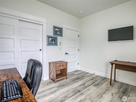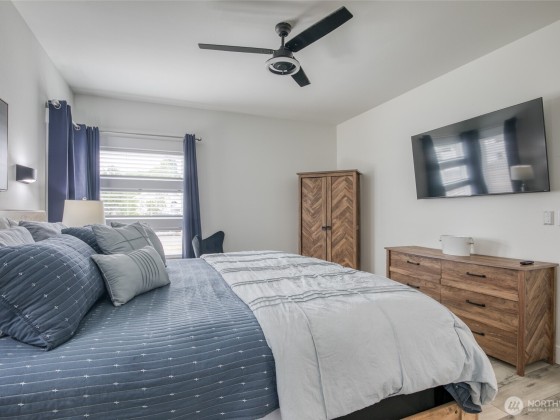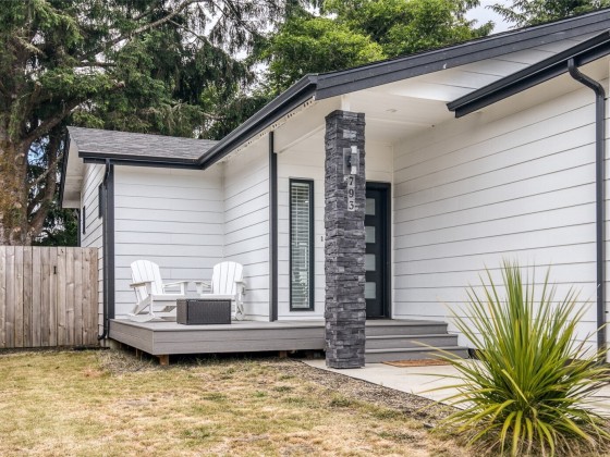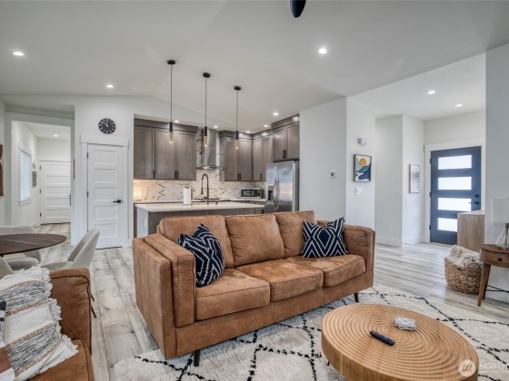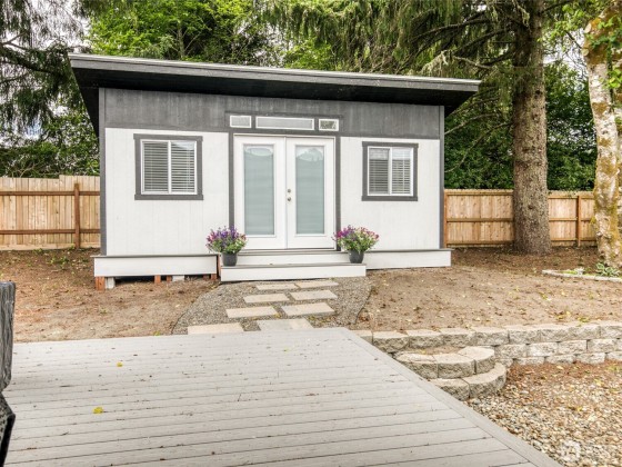 HOME & STUDIO. Beautiful Beach House with a Separate 200 Sq' Studio/Office. Quality craftsmanship with attention to detail. A Modern Mid-Century 2 bed 1-3/4 ba, 1,266 sq'. Enter the great room to tasteful décor. Slate surrounds the propane fireplace with beautiful design of cabinetry & shelving. High kitchen cupboards, quartz countertops & luxury vinal plank flooring. The primary bedroom is spacious with a beautiful tiled step-in shower. The guest room is grand for a home office. The separate 200 sqft studio is situated amongst the trees. It boasts french doors with plenty of natural light. An extended covered trex-deck is large & wonderful for entertaining. Oversized 1 car gar & Instant h/w. Furnishings & 2 KAYAKS AVAIABLE.