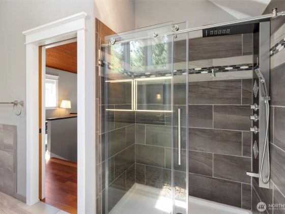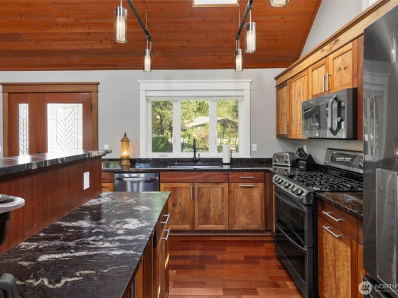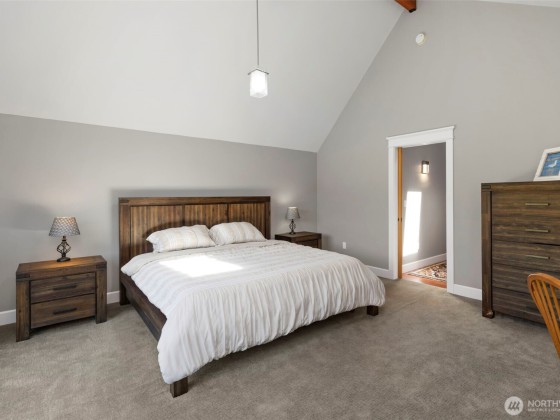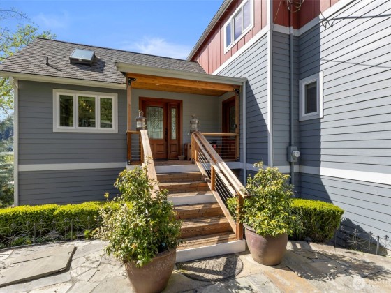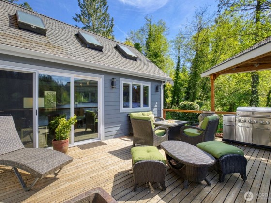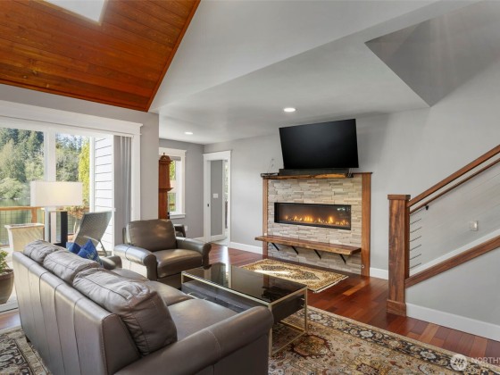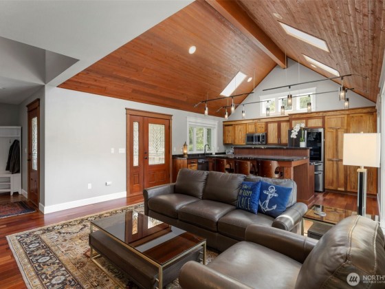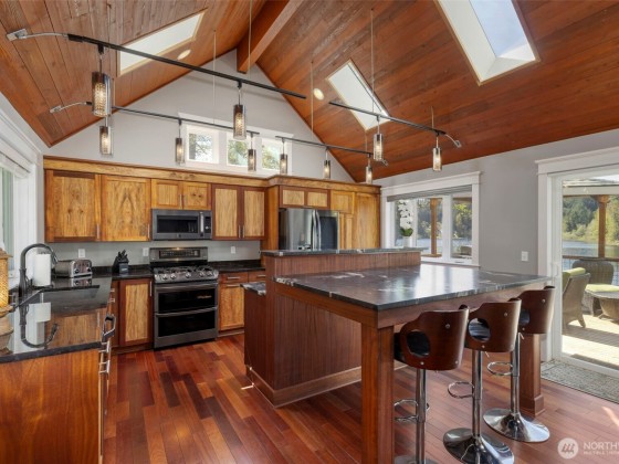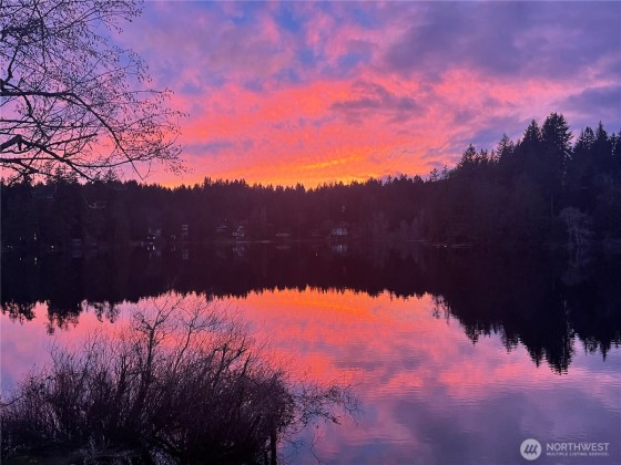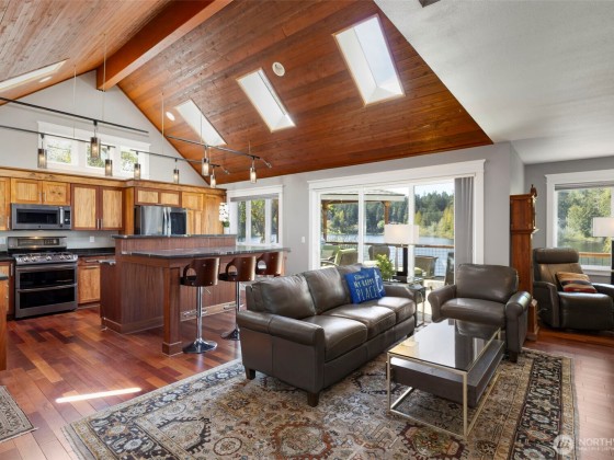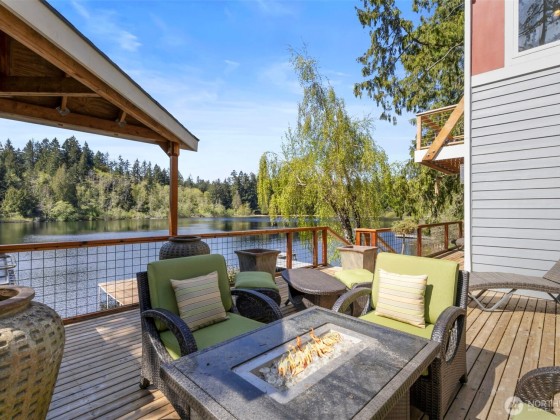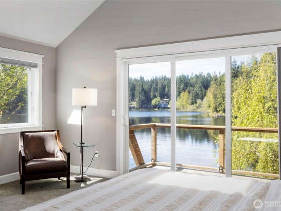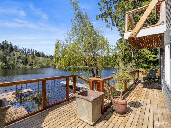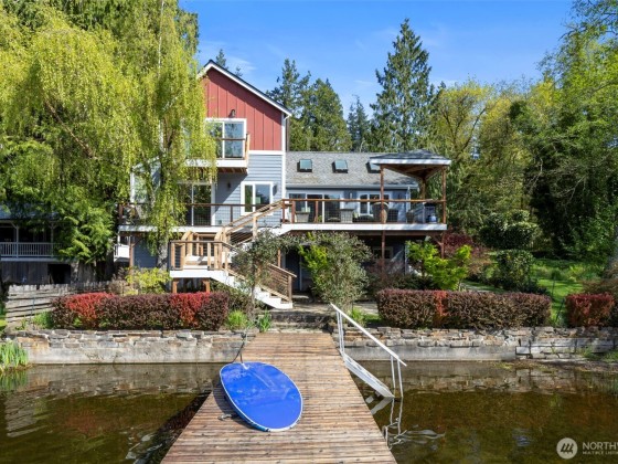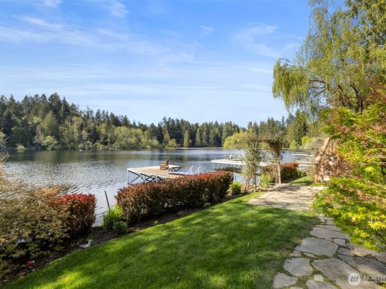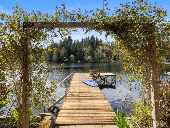 Enjoy stunning water views from nearly every room in this beautifully designed multi-level home. With two luxurious primary suites—1 on the main level and 1 upstairs—comfort and flexibility abound. Custom wood cabinetry, Brazilian cherry hardwood floors, and a rich cedar tongue-and-groove ceiling lend warmth and elegance throughout. Step outside to 52 feet of private waterfront and a 60+ foot dock—perfect for boating, paddleboarding, or simply soaking in the serene surroundings. Entertain guests on the lakeside deck or unwind while watching the abundant wildlife on this peaceful, quiet lake. All this tranquility, just minutes from Silverdale and only 10 minutes to Poulsbo!
