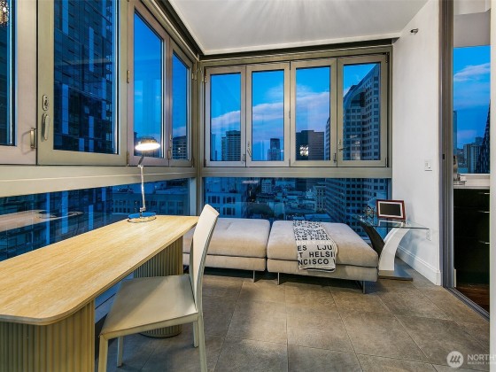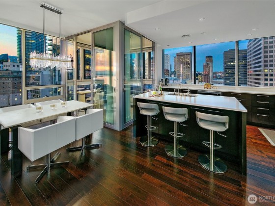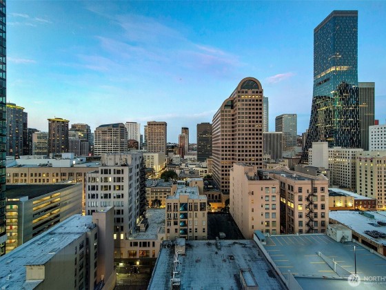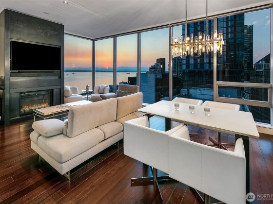 Exquisite Views! Stunning 18th floor corner home located at the coveted 1521- Gorgeous views of Elliott Bay, Puget Sound & Olympic Mountains. Expansive walls of glass, soaring 10' ceilings- home is flooded with natural light. Enjoy a unique blend of indoor-outdoor living in the enclosed glass solarium featuring retractable windows. Open-concept layout, gourmet kitchen, solid wood cabinets, top-tier appliance- dream home for entertaining. Enjoy oversized Primary with large walk in closet, spa-inspired bath,heated floors,jetted tub, oversized shower & dual vanities World class location & amenities- 24/7 concierge, rooftop BBQ, gym, yoga studio, conference room & entertaining spaces. Pike Place Market just across the street. 2pk- w/EV charger.