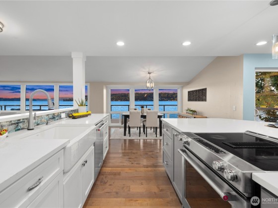 With 75’ of Lake Sammamish waterfront and 5,000+ SF of total indoor/outdoor living space, this breezy lakeside haven invites you to slow down and savor the moment. Spend sun-drenched days boating from your private dock, paddleboarding at sunrise or playing cornhole on the lawn. Walls of glass frame lake views from nearly every angle—gliding eagles, shimmering light and forested silhouettes. All bedrooms capture the water's beauty, including a vaulted primary suite and spa-like bath wrapped in glimmering tile. Renovated in 2017, the home blends creamy neutrals, blue accents and warm hardwoods for an airy coastal vibe. A 2-car garage, full-width deck, patio and gazebo set the stage for sunset dinners and starlit evenings by the lake.