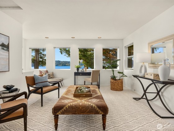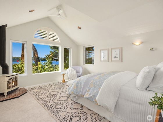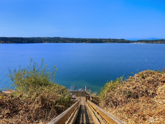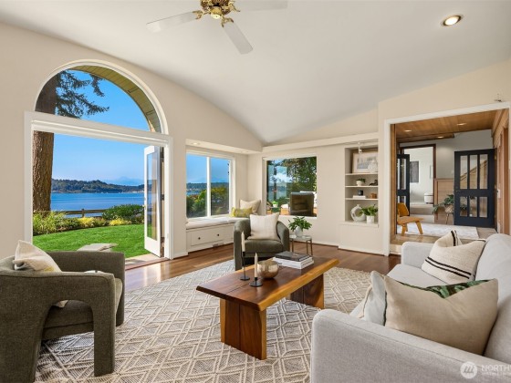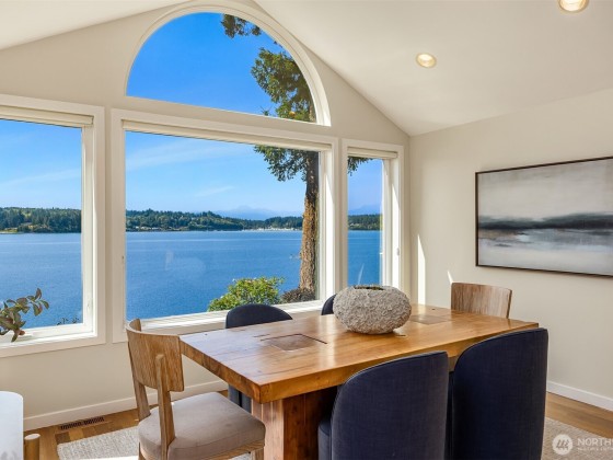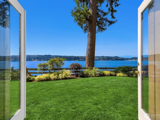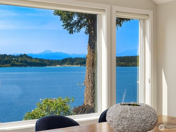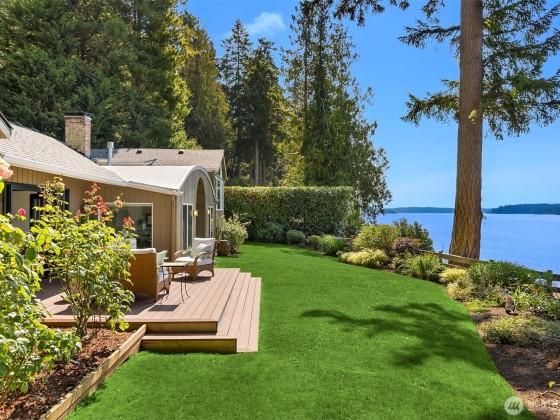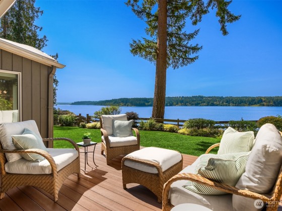 Rare West-facing waterfront oasis with private beach access on secluded Olympus Beach. Watch the sunset over the Olympics from multiple decks leading down to 123 feet of bulkheaded shoreline. This sundrenched beach house offers sweeping views from almost every room. Anchored by a large chef’s kitchen with Wolf range, granite and fireplace, this home is perfect for gatherings as French doors open to lush gardens and decks. Private main-floor primary suite with upstairs office/den. The opposite wing offers two bedrooms with shared bath. A separate 1065 sq ft guest home with full kitchen, bedroom, and bath provides a retreat, studio, or long stay. Quintessential waterfront living, minutes to Winslow.