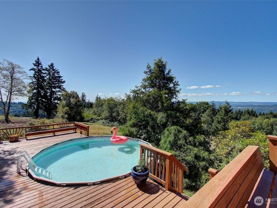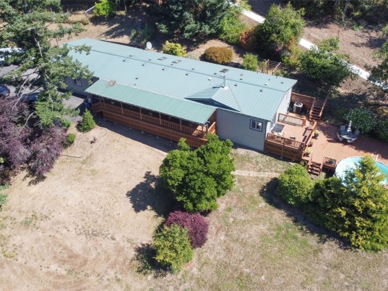 Stylishly updated manufactured home sits on 2 acres w/ fantastic territorial views. Beautifully updated kitchen & bathrooms, new interior & exterior paint plus new carpet and water heater! Every inch of trim, doors and door handles, faucets, sinks and newly tiled showers! New heat pump to be installed. Roof just a few years old. Close in (2 miles to I-5) acreage w/ large driveway (room for all your toys and RV) all this plus an above ground pool! Primary bedroom has roomy walk-in closet w/built-ins, attached spa like bath w/ walk-in shower, soak tub and a sink that is like a piece of art! Primary has a sliding glass door to a private deck and access to the pool. Oversized garage and easy to maintain yard with mature plantings. WATCH VIDEO!