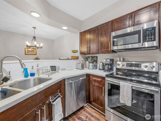 Immaculately maintained 2-bedroom, 2-bath condo in the heart of Bothell! This light-filled home features an open layout with vaulted ceilings, a cozy fireplace, and a private deck with extra storage. The kitchen and baths shine with modern finishes, while hardwood floors and quality touches throughout showcase the pride of ownership. Enjoy the convenience of your own garage plus an additional parking space just steps away. Smart-home upgrades add comfort and efficiency, and the well-managed community offers a clean ready to move in space. Perfectly located near I-405, shopping, dining, and all the Eastside has to offer. New roof, pet friendly and no rental cap—an exceptional find! Additional lender credit offered as well!