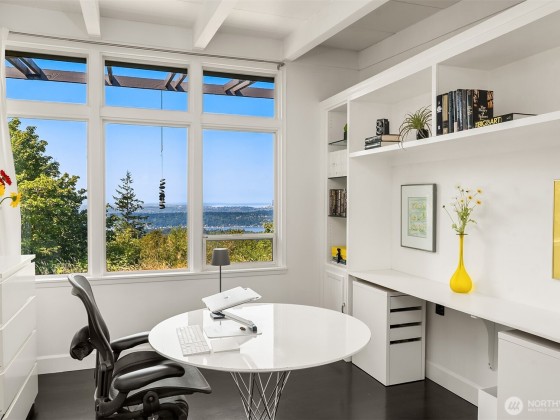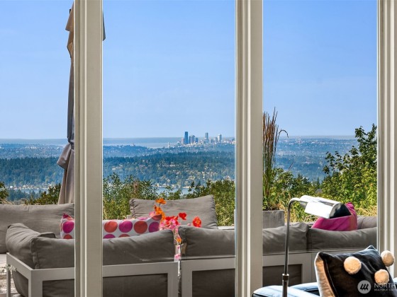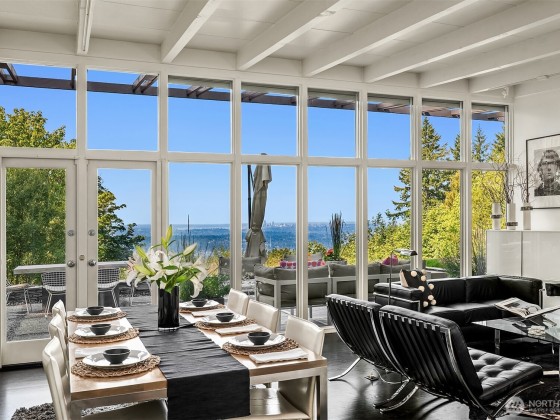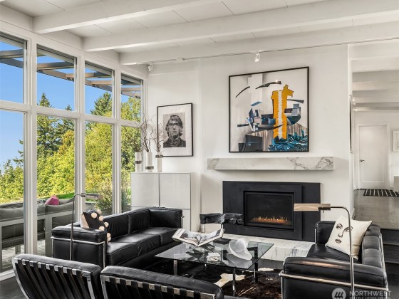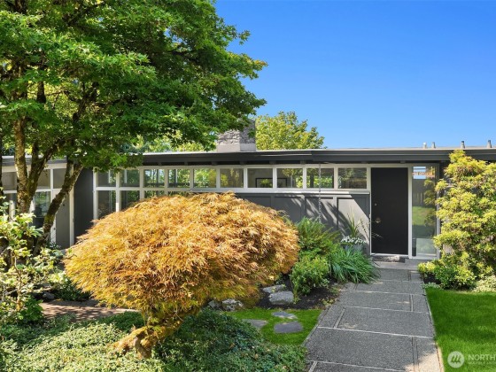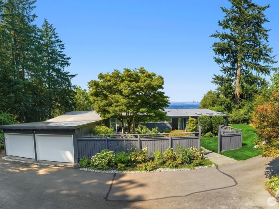 Mid-Century Modern Designed by Roland Terry This rare architectural one level home is located in the secluded Hilltop community founded by renowned UW architects with the intent of preserving original design & character Situated on a private lot of 31,500 sq ft, west facing, spectacular views of Lake Washington, Puget Sound, downtown Seattle & Olympic Mtns This home highlights iconic mid-century modern with walls of glass, hardwoods & polished concrete floors that blend indoor & outdoor living Thoughtfully updated, including plumbing, electrical, windows Remodeled kitchen featuring Calacatta marble island, quartz countertops & luxury stainless-steel appliances. Landscape with lush native plants, private setting & serene outdoor patios