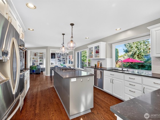 Traditional 2-story home featuring vaulted ceilings, grand entry, abundant natural light & gleaming hardwoods in coveted Seaview neighborhood. Updated kitchen features quartz counters, spacious island, double-oven and pantry w/ample workspace in cozy open-concept layout. Spread out w/ 5 bedrooms + office & 3 living spaces! Gorgeous, fully remodeled 5-piece primary ensuite & powder room. Enjoy seamless indoor/outdoor living in wonderfully landscaped, fenced backyard w/ paved patio, large yard for play, and handsome fountain. Oversized 2 car garage allows for extra storage. Outstanding Edmonds Schools, excellent nearby parks to explore, plus beaches & downtown Edmonds just minutes away!