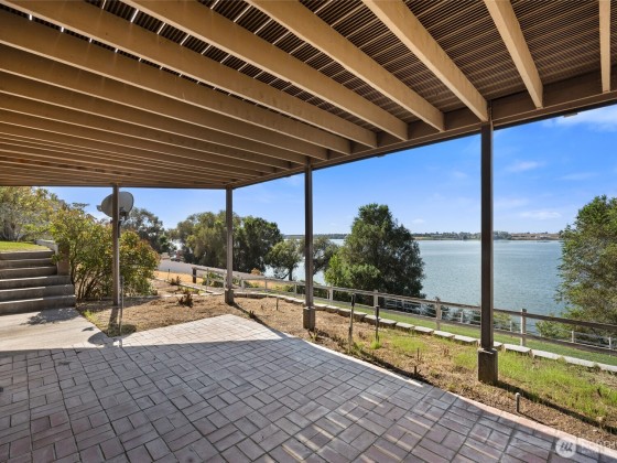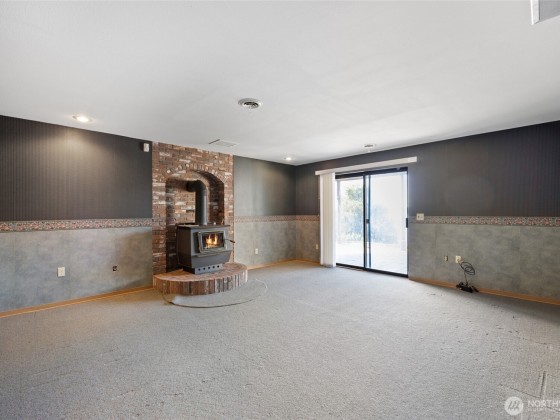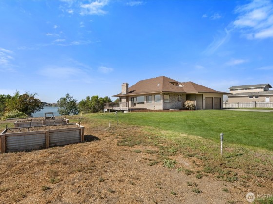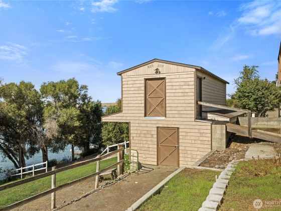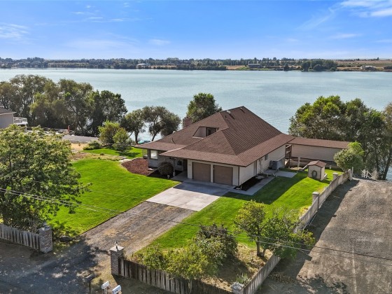 Waterfront home w/ 150’ lake front & Incredible sunset views. This 2-story home w/ daylight basement has 3,276sf w/ 4-beds + Den, 3-baths. Fenced pasture, well house, & outbuilding w/ horse barn (2 stalls), root cellar, & workshop w/ power. Wrap-around deck on main-level w/ patio below. Kitchen, living rm, dining & 2 beds w/ bath & laundry on main floor. Kitchen w/ wood cabinetry, updated appliances & eat-in nook. Living room w/ wood burning fireplace & built-ins. Lg laundry w/ sink. Upper-level primary suite w/ lake views, balcony, en-suite bath w/ garden tub & laundry chute to the laundry rm. Bsmt has family rm w/ wood stove, 3/4 bath, 1-bed+den. Built-in vac system, UGS. Addl lot available next door -increase water frontage to 225’.