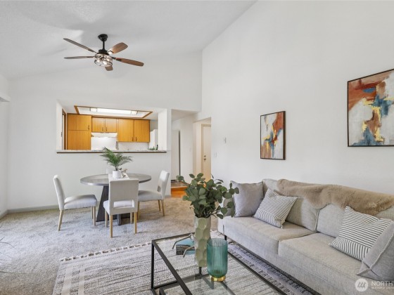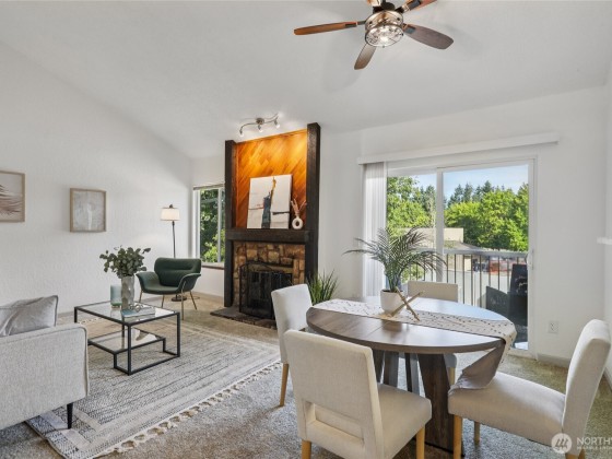 With a spacious, thoughtful floor plan, this turnkey top-floor condo is ready to call home. Featuring 2 bedrooms and 1.75 baths, it offers vaulted ceilings, abundant natural light, and a cozy fireplace. The roomy kitchen includes new counters, generous storage, and opens to a large dining and living area with access to a covered deck. A utility/laundry room adds convenience. The primary suite boasts a private ¾ bath and large closet, while the updated main bath provides extra storage. Community perks include a pool, clubhouse, and sports courts. Trail just around the corner, close to shopping, dining, gyms in the Kent School District No rental cap or special assessments so it’s a smart choice for first-time buyers, downsizers, or investors!