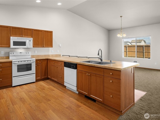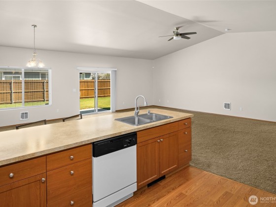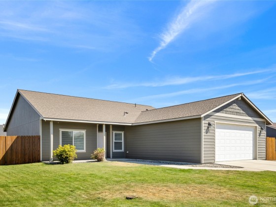 Move-in ready 2,000 sq ft rambler on a corner lot! Vaulted ceilings and a flexible den/office welcome you at the front of the home. The open-concept great room flows into a kitchen with eating bar and pantry. Spacious primary suite features a walk-in closet, dual-sink en suite, and large linen closet. Two oversized guest bedrooms and a full bath provide ample space. All appliances included! Oversized 2-car garage with taller door offers storage plus parking. Fully fenced backyard with extra parking and double gate—perfect for added access or storage.