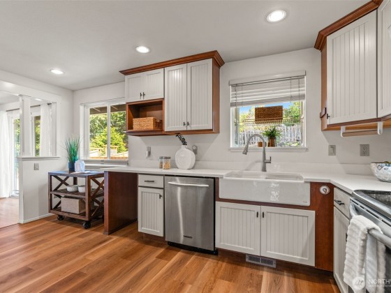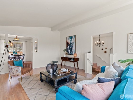 Nestled in a cul-de-sac in the Edmonds Bowl, this updated home blends classic charm with thoughtful modern improvements. Just a short stroll brings you to downtown shops, restaurants, and the scenic waterfront. Recent upgrades include an updated bathroom, new flooring in the basement, kitchen, and breezeway, renovated basement walls, remodeled closets, a refreshed backyard, new garage door motors, and an upgraded electric panel. The yard showcases colorful native plantings and a sport court for basketball or pickleball. Enjoy morning coffee on the east-facing deck and sunsets on the spacious west deck. The updated lower-level family room is perfect for movie nights, hobbies, or guests. 2 car garage plus additional parking for RV/boat.