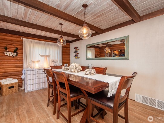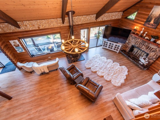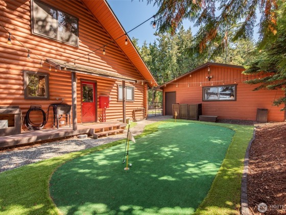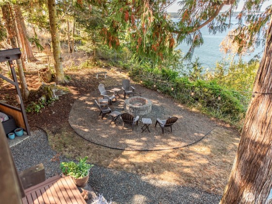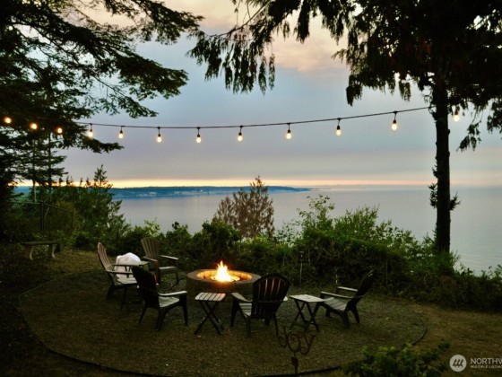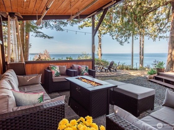 Remodeled log cabin-style waterfront home with unobstructed Strait views. Watch cruise ships sail by, spot whales and eagles, listen to the surf, and enjoy outdoor living with expansive deck, hot tub, fire pit, putting green, and covered cabana lounge. Beach access, Rainshadow disc golf, and Miller Peninsula State Park hiking/biking trails are minutes away. Inside, vaulted ceilings and expansive windows frame the view. Features include solid-surface floors, cozy wood stove, walk-in pantry, dry bar, and flexible loft for guests, office, gym, or media. Detached garage and generous parking add convenience. A rare Sequim waterfront view home blending rustic charm with tasteful modern updates and a lifestyle to match on the Olympic Peninsula.