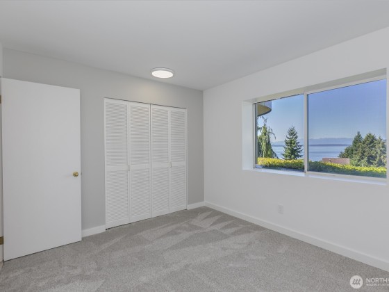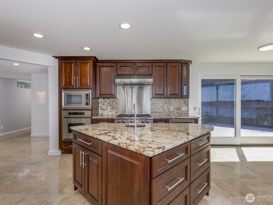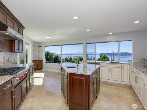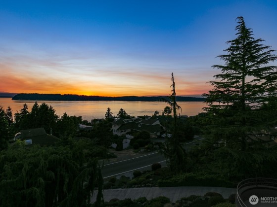 Quintessential NW Contemporary with a truly fabulous view to the west - the Olympics, Admiralty Inlet, shipping lanes + gorgeous sunsets. Tall ceilings, open spaces, not a cookie cutter home. 2nd floor primary w/private deck + office, full totally remodeled bath w/ porcelain tile & walk in closet. Main level family room or dining room, you choose, eating space in the island kitchen. The island kitchen has SS appliances, wine refer, Wolf, Dacor, Sub Zero, GE Profile, stone counters, new cabinets, travertine tile on the main, marble tile on lower, home just painted inside-out, new carpet, each level has in floor hot water heat which is super comfy, 2 mini-splits upstairs, close to shopping and Kamiak HS! Floor to ceiling stone gas fireplace.