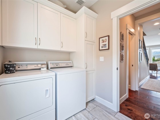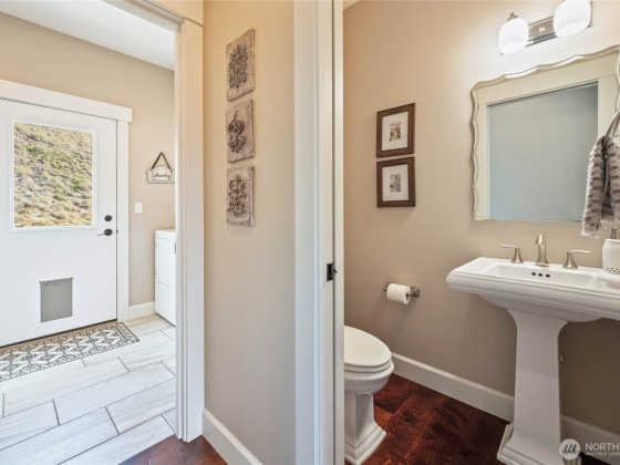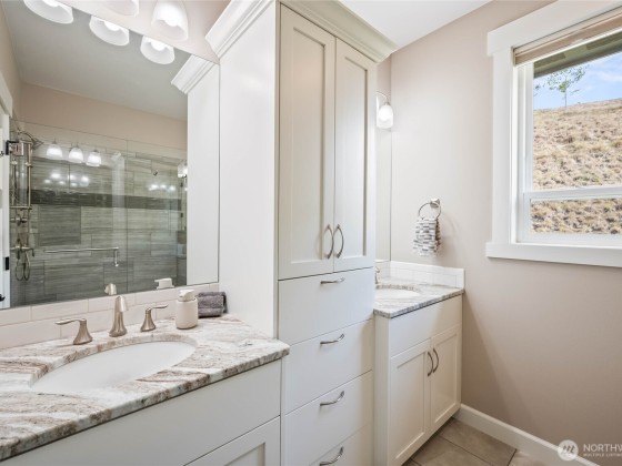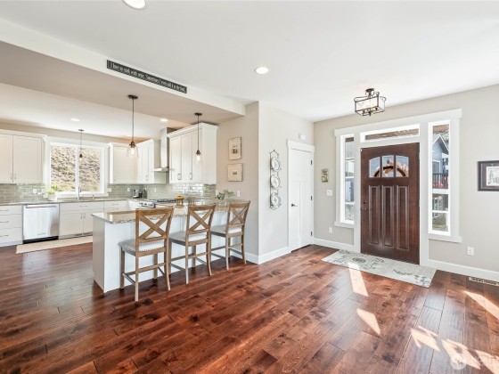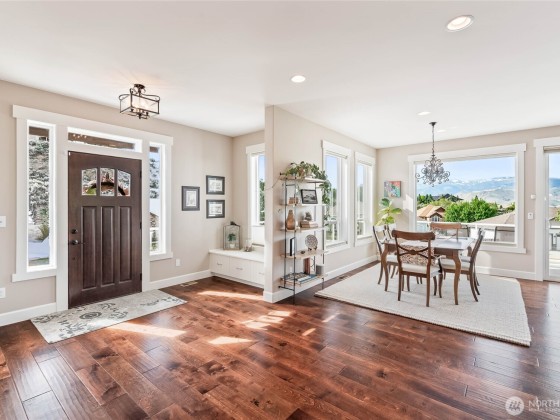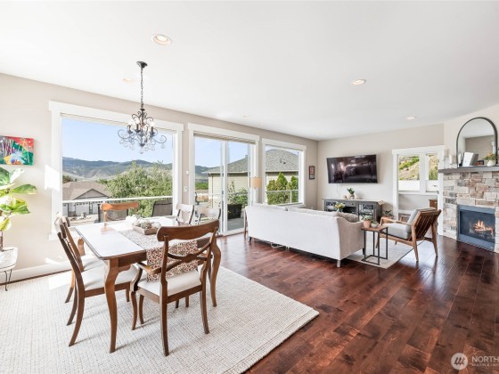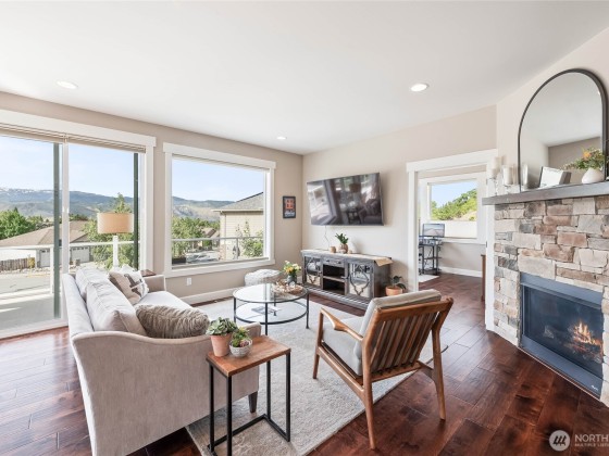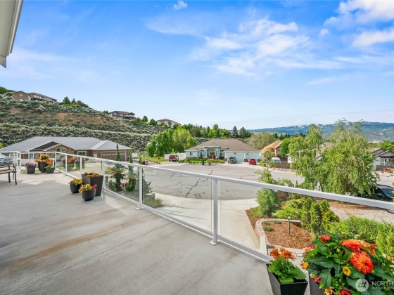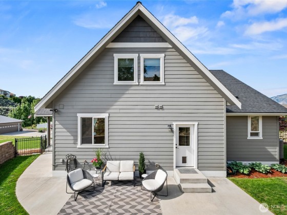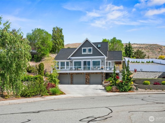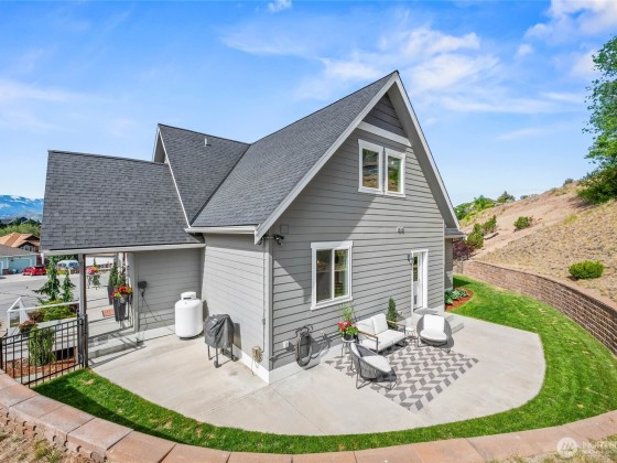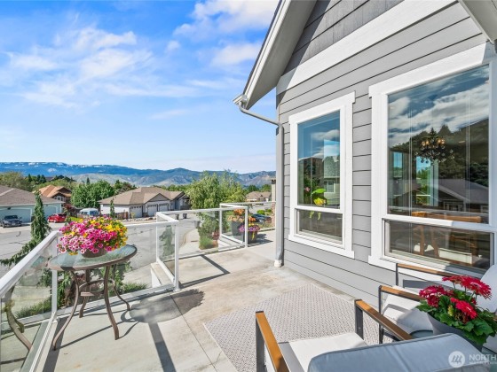 This property offers a panoramic view and is quietly situated at the end of a cul-de-sac, conveniently located near East Wenatchee's best amenities, including the beautiful Wenatchee Golf & Country Club. The great room floor plan combines the kitchen, dining room, and living room, allowing for breathtaking views of the surrounding scenery. The kitchen is a cook's dream, featuring a dual fuel cooktop/range, a Bosch refrigerator, and ample counter space. The main floor includes a spacious office and a primary suite, which features double sinks, a tile shower, and a walk-in closet. Upstairs, you'll find two additional bedrooms and a bathroom, all with a charming craftsman feel. Lower level family room. Private & secluded back patio area.