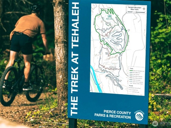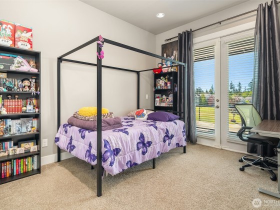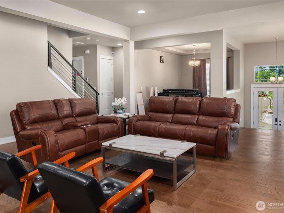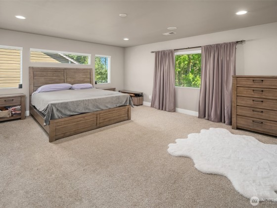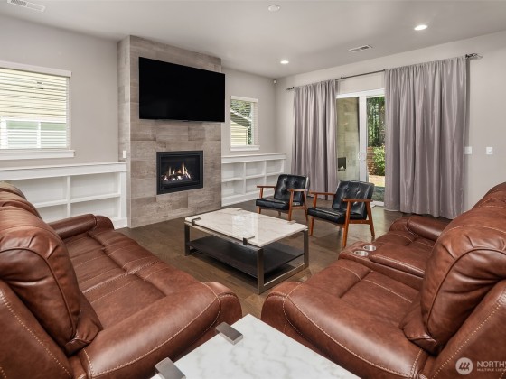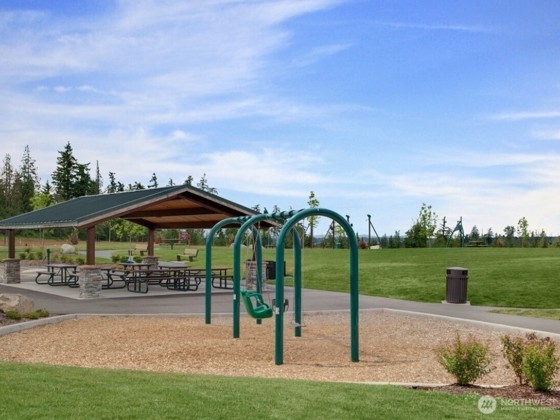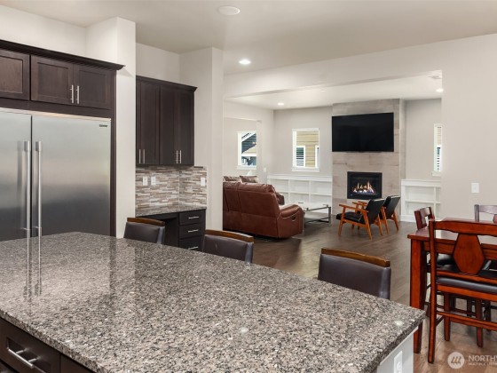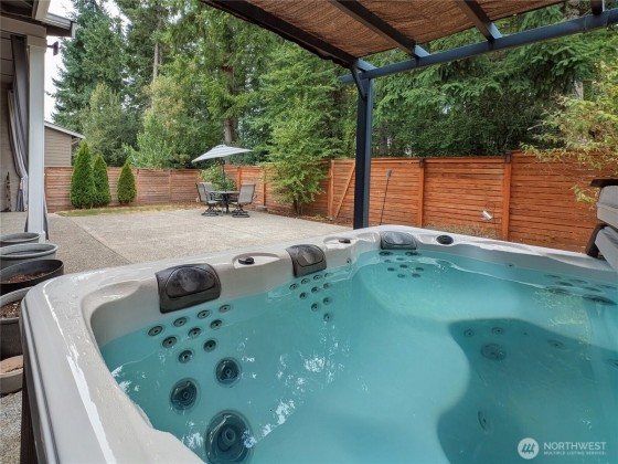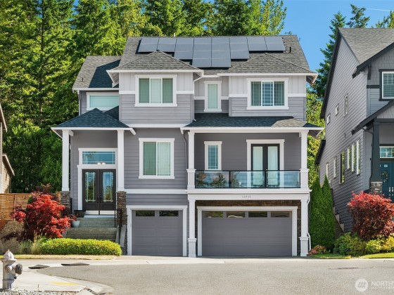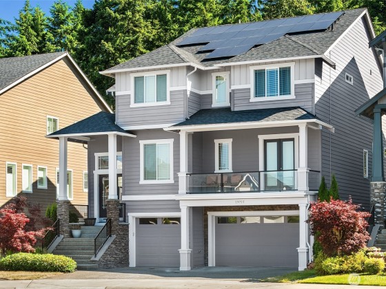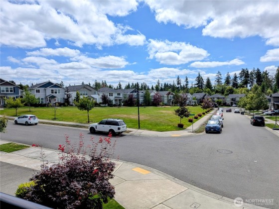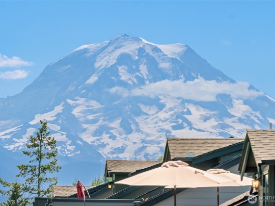 Your dream retreat w/ panoramic Mt. Rainier views awaits! This 4-bedroom, 2.5-bath home w/ 3 car garage, A/C & solar panels is located across from the community park & backs to Forest Loop Trail leading to both Forest Park & Hounds Hollow Dog Park to the left or Post & Pour Coffee to the right. Unwind on the rooftop deck around the cozy gas firepit. Inside, the main floor impresses w/ hardwood floors throughout, a private den/bedroom w/ its own balcony, & a chef’s kitchen featuring stainless steel appliances & an oversized island, including built in speakers throughout. The spacious great room flows to a covered outdoor patio w/ a fireplace, an extended patio area, hot tub, & fully fenced yard w/ gate leading to the trails. Welcome Home!