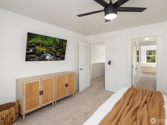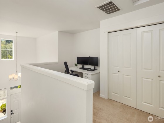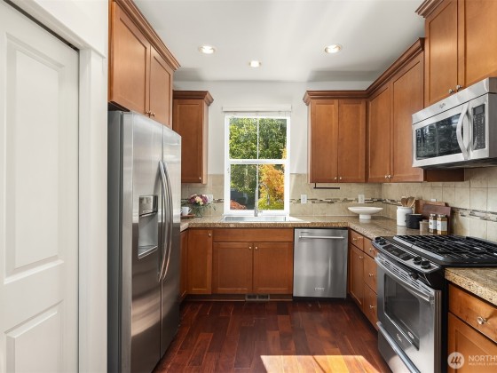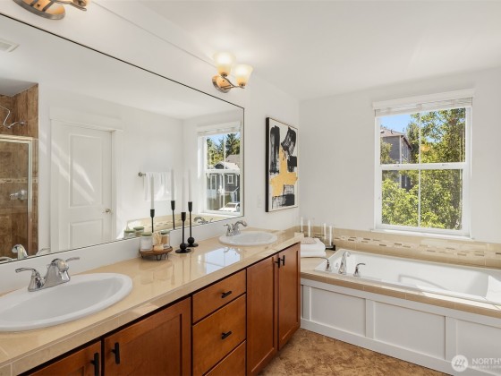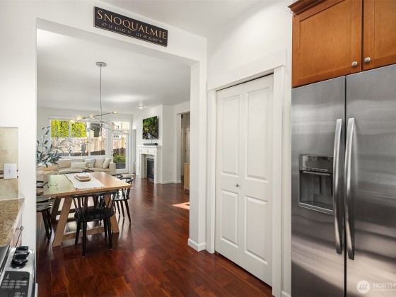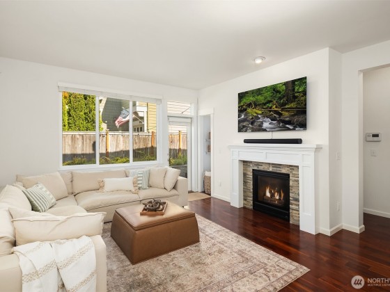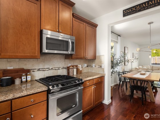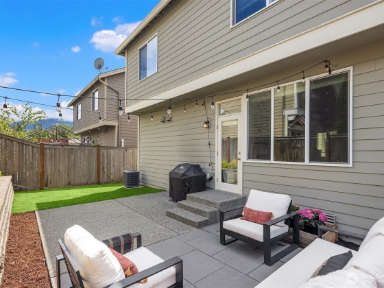 Step inside to soaring ceilings, warm hardwoods, and a cozy fireplace that set the tone for this inviting Snoqualmie Ridge retreat. The kitchen offers granite counters, stainless appliances, a gas cooktop, and rich cabinetry—ideal for everyday meals or casual entertaining. Upstairs, the primary suite includes two closets and a spa-like 5-piece bath, joined by two additional bedrooms, a full guest bath, and a versatile flex space. Exceptional woodworking details add timeless character. Outside, the turf backyard with lush landscaping provides a low-maintenance space for play, pets, or gatherings. With A/C, trails, parks, and the vibrant Ridge community at your doorstep, this home blends comfort, functionality, and adventure.