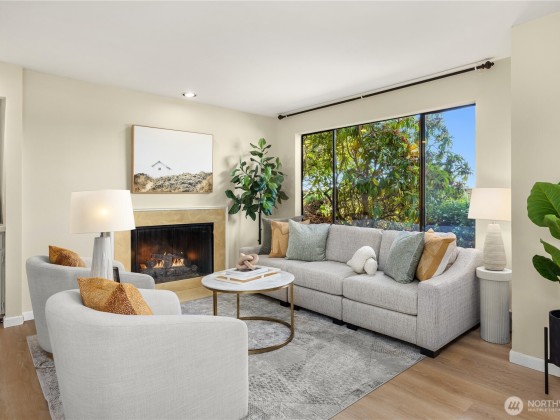 Enjoy stunning Bellevue skyline views from this beautifully updated 2BR/2BA condo in a tranquil community with no rental cap. The open-concept living and dining area features a wood-burning fireplace and a slider leading to a quiet backyard—perfect for morning coffee, entertaining, or evening relaxation. Recent updates include luxury vinyl flooring, fresh paint, remodeled baths with new cabinets, fixtures, and shower. The spacious primary suite offers a walk-in closet and ensuite bath, while the second bedroom is ideal for guests or a home office. Two parking spaces (1 covered). Minutes to downtown, Spring District, light rail, shopping, dining, parks, and trails. Bellevue schools and easy freeway access make this home a rare find!