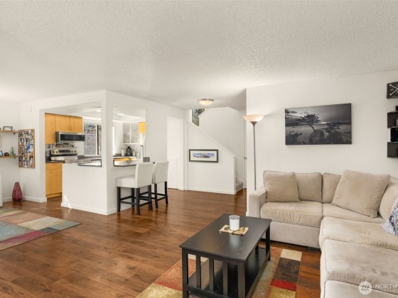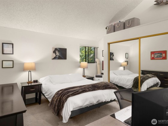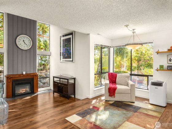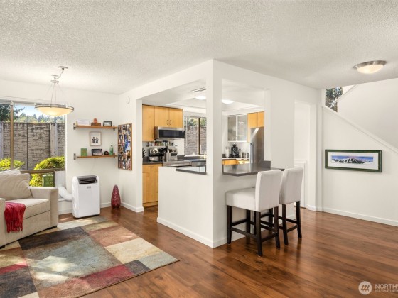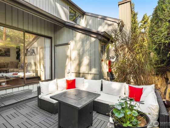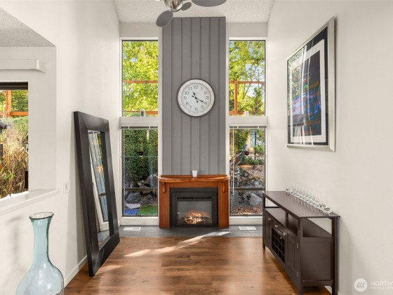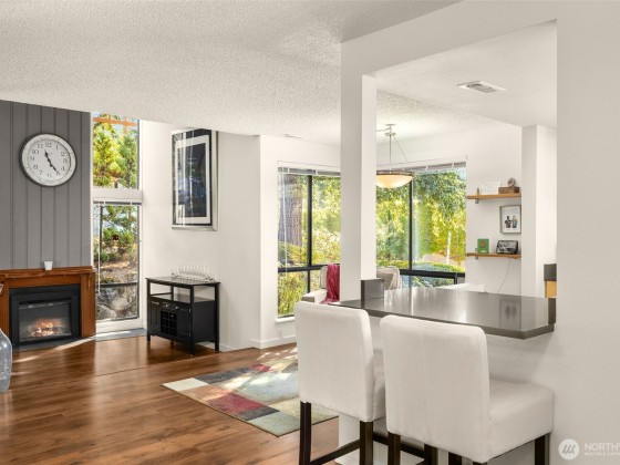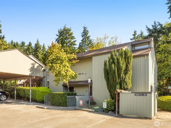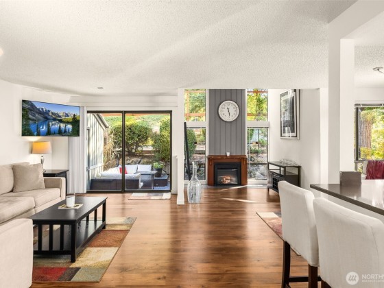 Beautiful NW Contemporary townhouse end unit in Yarrowood! Prime location near Seattle, DT Bellevue, Redmond & Kirkland. Vaulted ceilings and large windows offer tons of natural light and views of mature landscaping. The great room features hardwood floors, a wood-burning fireplace and an open floor plan that leads to a beautiful private patio—perfect for enjoying PNW evenings. Upstairs offers 2 bedrooms, full bath, and a laundry room. Just steps from the pool, tennis court & clubhouse. Includes 2 parking spaces, extra storage, and no rental cap!