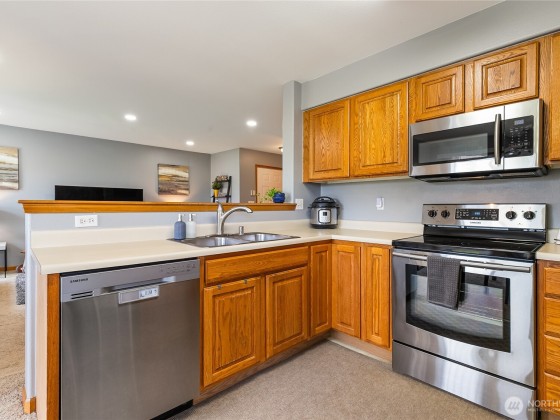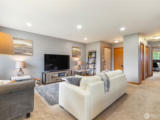 Come explore this meticulously maintained top-floor condo in the desirable Fir Ridge 1 community, offering a serene backdrop to the green space. This end-unit features an open layout, flooded with natural light that creates a warm and inviting atmosphere throughout. The home boasts stylish paint tones, custom installed recessed lighting, sleek stainless steel appliances, and a convenient stackable front-load washer/dryer. Enjoy the added benefits of assigned covered parking, central vac, and a private covered deck with a spacious storage area. This pet-friendly unit allows up to two indoor cats and/or dogs. Situated in a prime Cordata location, you'll be just minutes away from Cordata park, I-5, bus lines, Costco, Trader Joe's, and more.