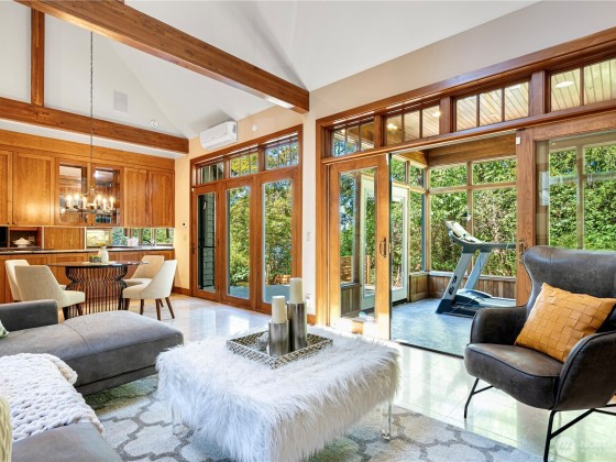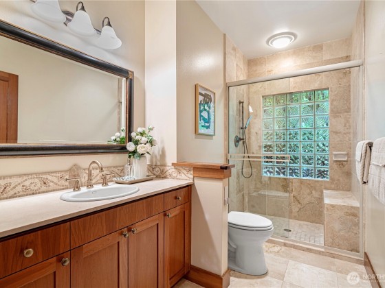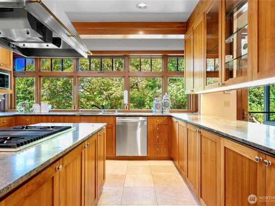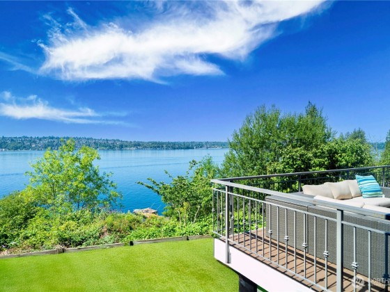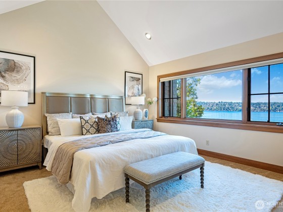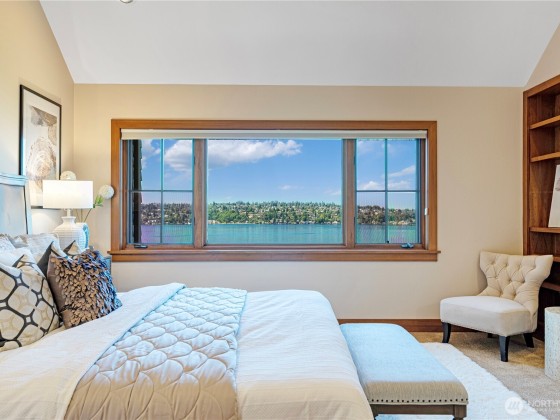 Enjoy breathtaking views of Lake Washington and the Olympic Mountains from this architecturally distinctive home, thoughtfully designed by Robert Maloney. Featuring a gourmet kitchen and fabulous entertaining spaces, this residence blends elegance with comfort.The interior showcases travertine flooring, radiant heat, vaulted ceilings, and skylights, creating a bright and welcoming ambiance. Upstairs, you'll find three spacious bedrooms, including a luxurious primary suite with a spa-like bath, walk-in closet, and gorgeous views. The owner use main floor office as a fourth bedroom. Practical features such as private driveway, whole house AC, central vacuum, and a 2 car garage add to the home's functionality.